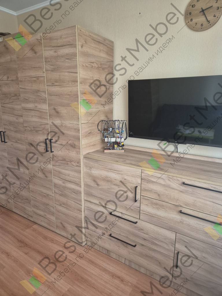 Заказ 00000694204, изделие ЭСКИЗ №00000694204 Комод Нордли Nordli 11 (1500х990х470)Были куплены изначально шкафы - цвет золотой дуб крафт у другого производителя. На разных сайтах искала возможность изготовить комод такого же цвета по своим размерам (стоимость получалась дороже, чем я отдала за шкафы :))). Случайно наткнулась на бестмебель. Выбрала цвет, свой размер и то, что хочу. Т.к. основной критерий- ящики для нижнего белья и полки для хранения постельного белья и подушек. Единственное, что докупила отдельно - ручки. Т.к. у шкафов уже ручки были. Привезли всё в срок, мой папа собрал его. Я очень довольна .