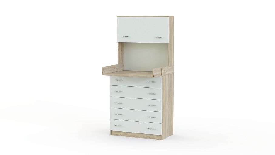 Комод пеленальный Альберт 2 BMS не занимает много места, а надстройка с закрытой полкой позволяет разместить в быстром доступе средства гигиены и прочие необходимые для ухода за ребенком вещи. В нижней части комода располагаются пять выдвижных ящиков для одежды, пеленок и постельных принадлежностей. Откидной столик легко увеличивает пеленальную поверхность и превращается в полку, когда не используется. Купить комод пеленальный Альберт 2 BMS вы сможете в нашем интернет-магазине с выбором фурнитуры и цвета по каталогу.