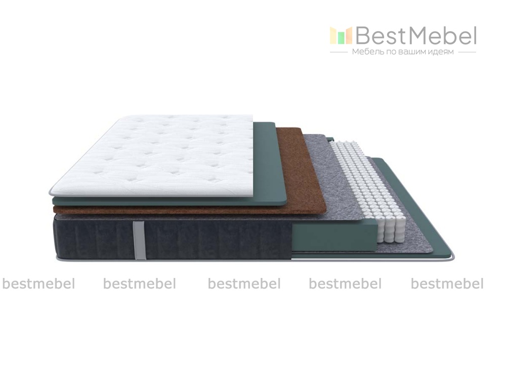 Состав: Меморикс 2см \ Ортофом (ППУ) 2см \ Ортофом (ППУ) высокоэластичный 5 см \ Спанбонд \ EVS620 16см \ Спанбонд \ Ортофом (ППУ) повышенной жесткости 2см \ Короб Ортофом (ППУ).