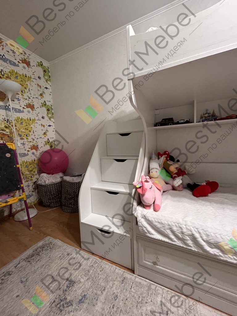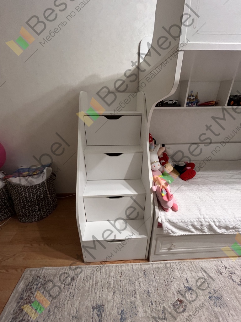 Лесенка Лисенок в интерьер под ранее купленную двухъярусную детскую кровать вписалась идеально - см. фото. Это плюс от возможности сконфигурировать под свои размеры до заказа, я именно так и заказывал. Собирается не сложно, но есть нюанс (может мне так повезло) : уже насверлены отверстия под крепление полозьев ящиков, соотв-но при сборке открытыми полками в другую сторону эти отверстия оказываются снаружи. Элементарно заклеиваются идущими в комплекте липучками. Да, липучка на фото ступеньки - специальная нескользяшка для ванн, прозрачная. Без нее ступени для использования в носках скользковаты.