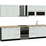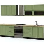 В комплект для современной кухни Экран 2 BMS входит по четыре вместительных модуля в нижней и верхней части. Шкафчики имеют выдвижные, распашные и открывающиеся вверх ящики, отвечающие самым разнообразным нуждам. Выполненные в модном темном оттенке, фасады украшены рамочной фрезеровкой. Они не только практичны и долговечны, но и эффектно смотрятся. Дополняют оригинальный дизайн крупная фурнитура, прозрачные стеклянные дверцы посудных шкафов и устойчивые алюминиевые ножки.