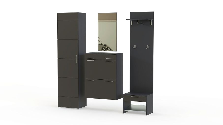 Гарнитур для прихожей состоящий из пяти частей не только вместительный, но и прекрасный конструктор для создания индивидуального интерьера. Каждая часть независима от других, можно менять местами оставив в понравившемся порядке, в зависимости от свободного пространства можно регулировать компактность конструкции.