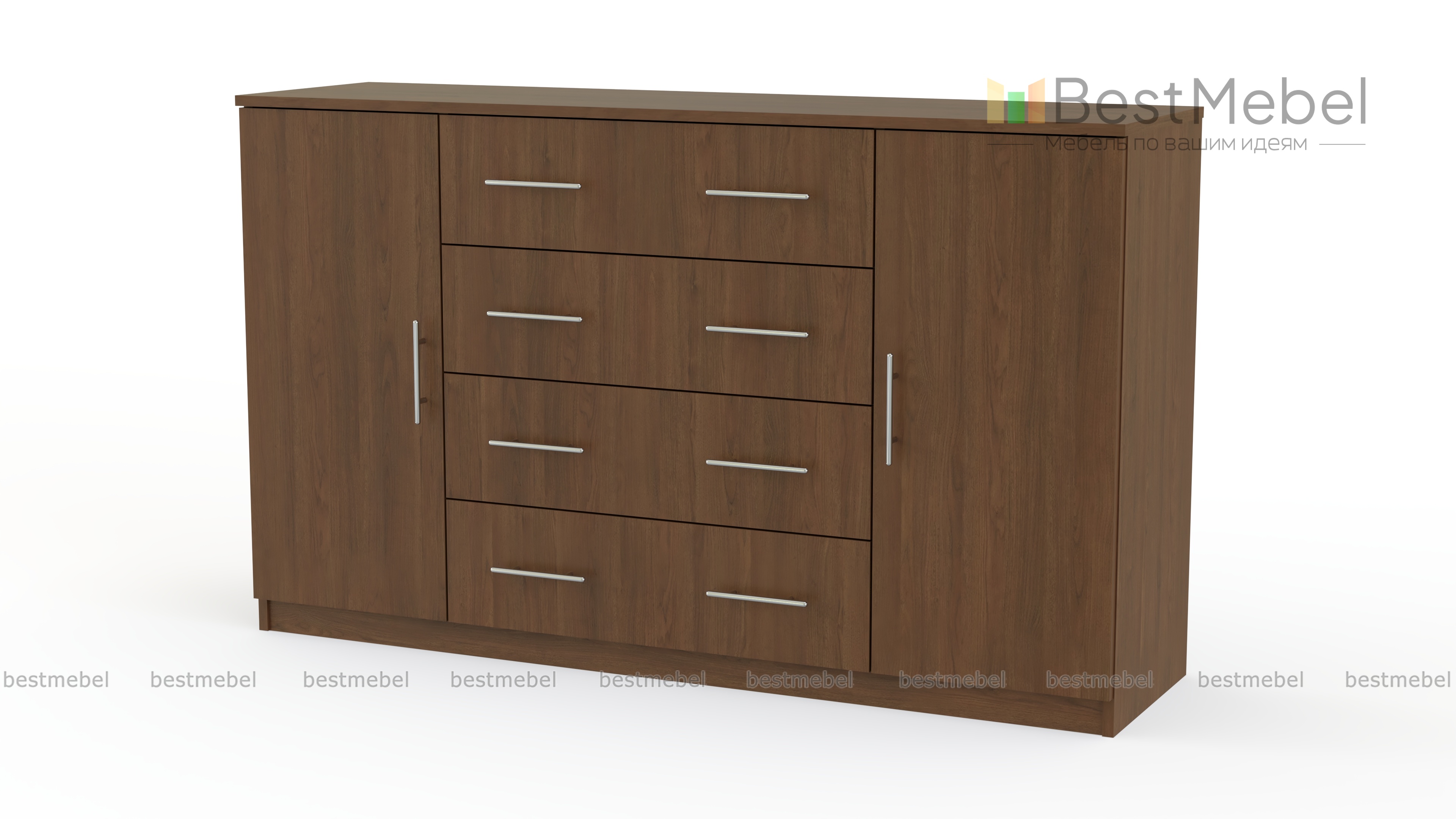 Довольно большая, вместительная модель выполнена в современном классическом стиле, выглядит прочной и солидной. Комод Светлана СВ-16 BMS имеет четыре больших выдвижных ящика на толкателях посредине и две тумбы с полками по бокам, выпил под плинтус 7*3, дно ящиков из лдсп. Он отлично подойдет для спальни или гостиной, даст возможность комфортно расположить множество домашних вещей. Небольшая цена позволит купить комод Светлана СВ-16 BMS для дачи.