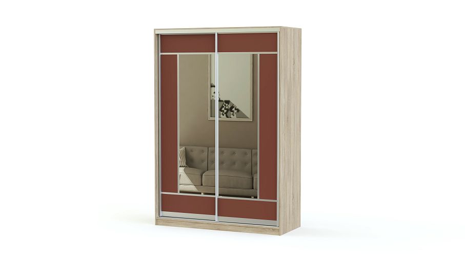 Вместительный шкаф-купе Леона BMS с двумя раздвижными дверями отлично подойдет для хранения вещей и оформления интерьера помещения. Благодаря использованию прочного алюминиевого профиля в комбинации с зеркалами и терракотовыми вставками создается эффект легкости и простоты. Центральная часть фасада оформлена зеркалами, вокруг которых имеется яркое обрамление. Внутреннее наполнение может быть скорректировано по желанию и дополнено выдвижными ящиками или полками.