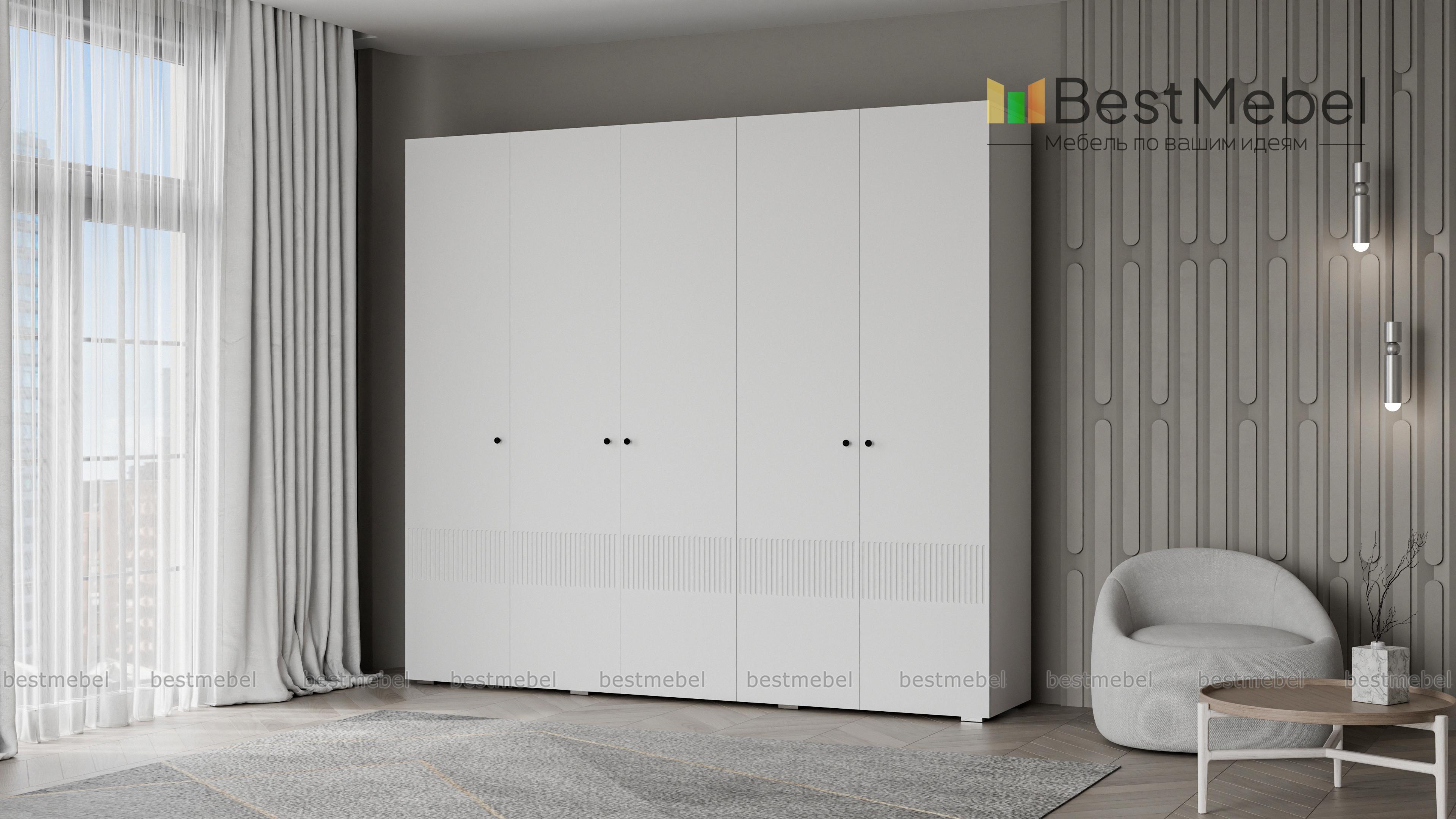 Шкаф распашной Джосс 5 BMS — это яркая современная модель с цветным фасадом и фрезеровкой. Комплектация с двумя штангами и полками подходит как для сложенной, так и развешанной на вешалках одежды, а также обуви и коробок с аксессуарами. С помощью этого пятидверного шкафа вы сможете удобно и эстетично организовать хранение гардероба для двух человек. Купить шкаф распашной Джосс 5 BMS с выбором размеров, цвета и фурнитуры приглашаем к нам в интернет-магазин.