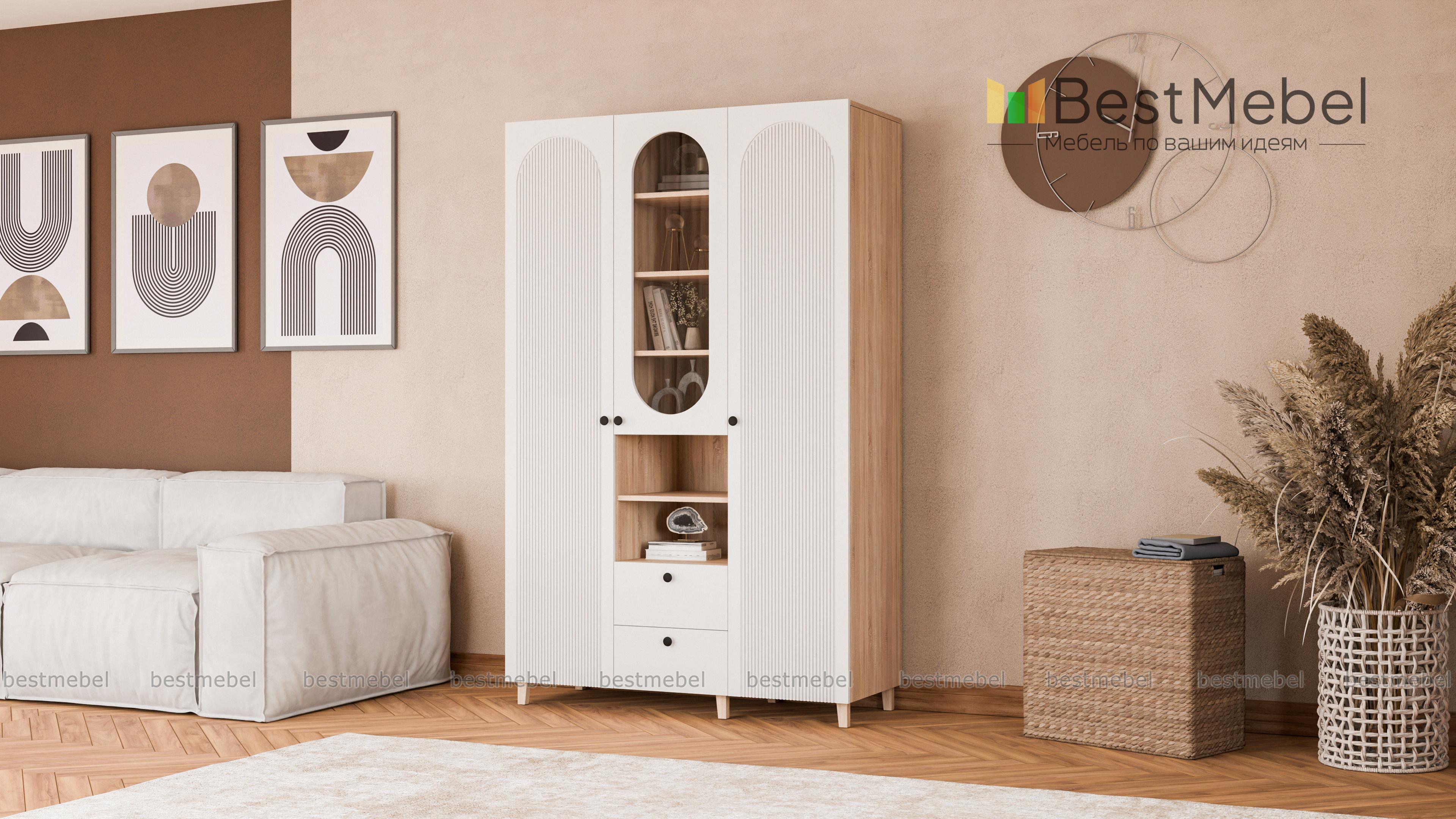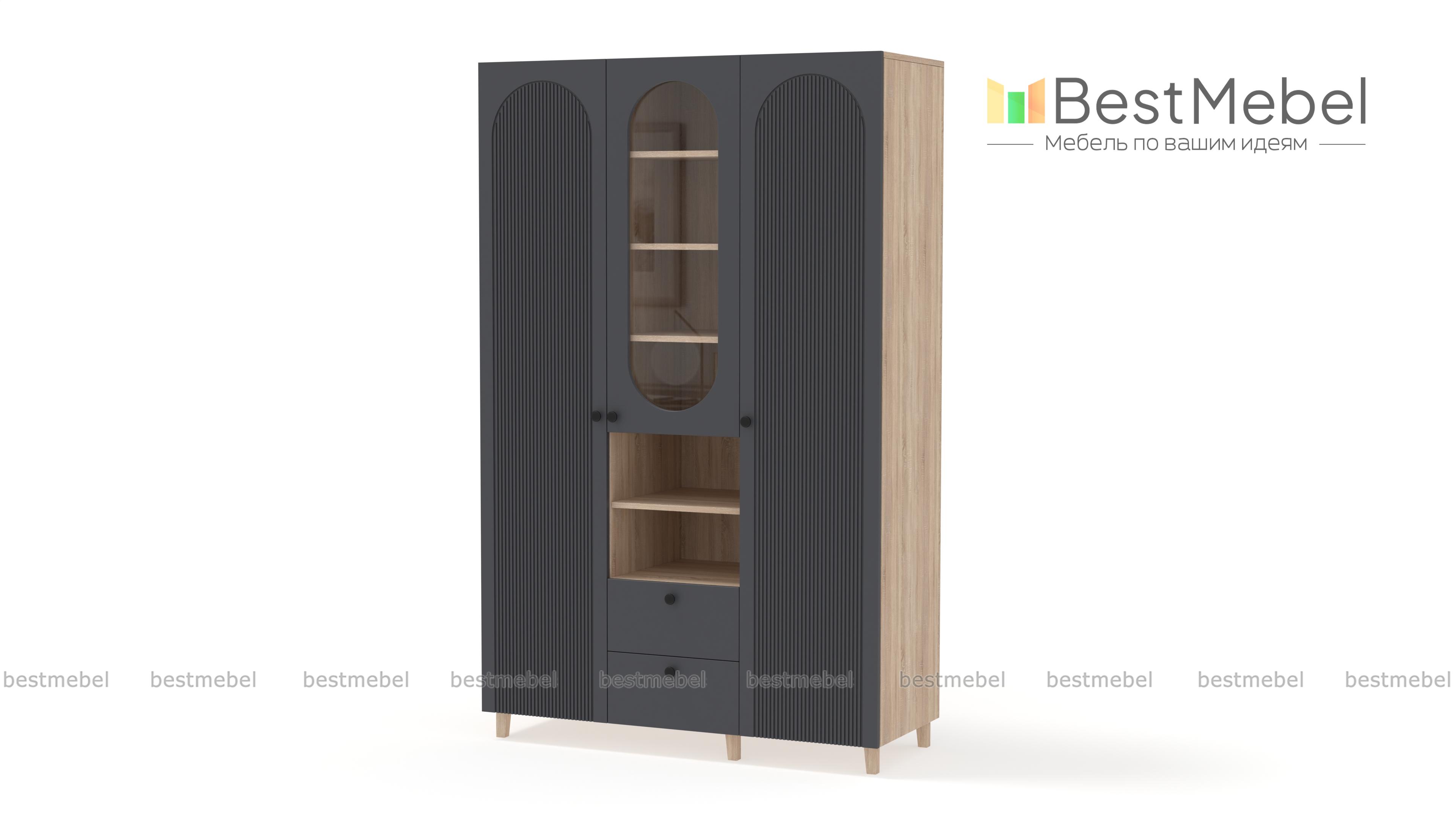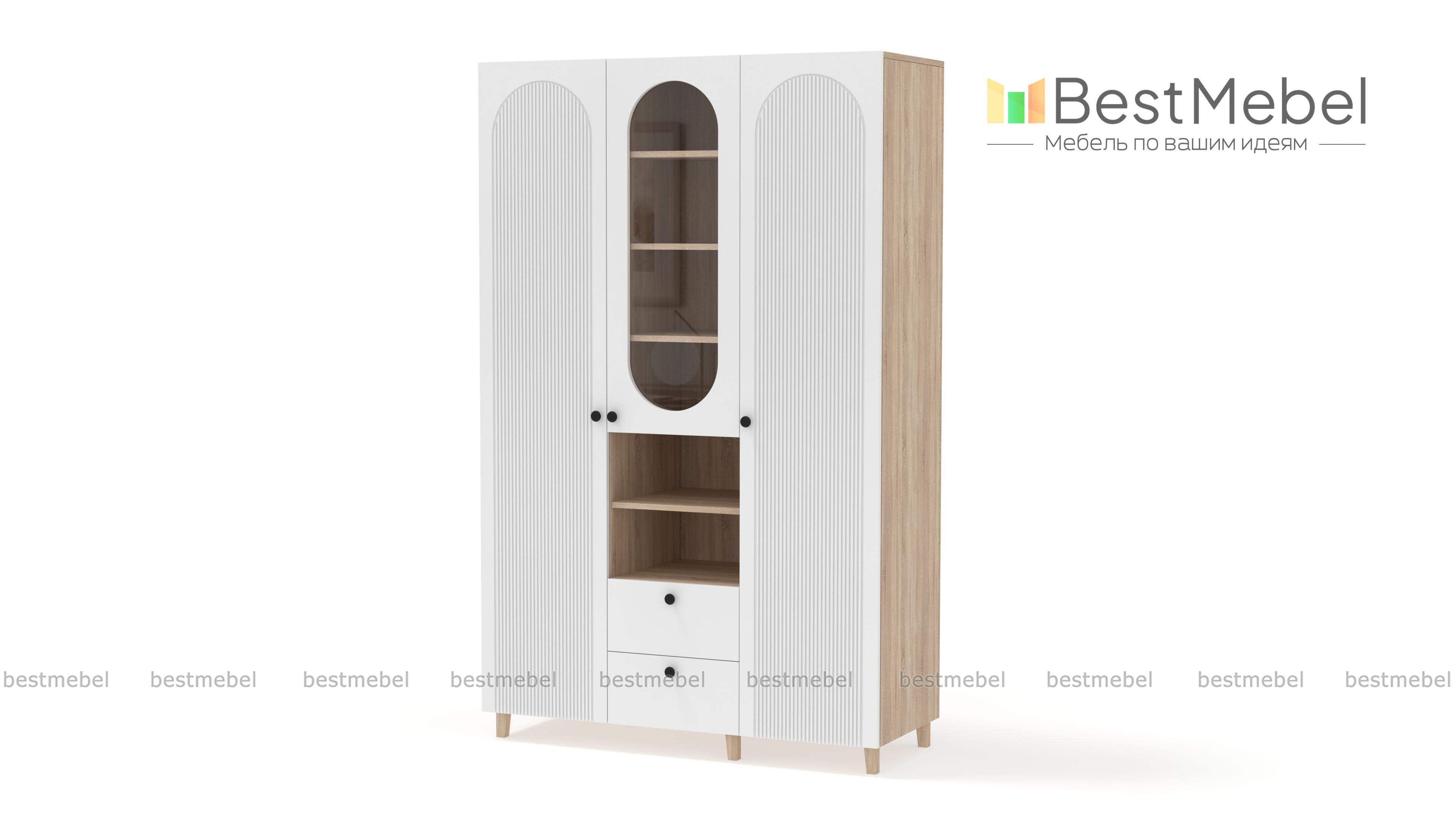 Шкаф распашной Рене 11 BMS с деревянными опорами поможет вам красиво и удобно оформить гостиную, детскую комнату или спальню. Декоративные овальные вырезы смягчают острые углы, а уюта добавит теплая цветовая гамма. Два закрытых распашных отделения разделены комбинированной секцией со стеклянной дверцей, открытыми полками и двумя выдвижными ящиками. Купить шкаф распашной Рене 11 BMS можно на сайте нашего интернет-магазина, подобрав размеры и оттенки из каталога.