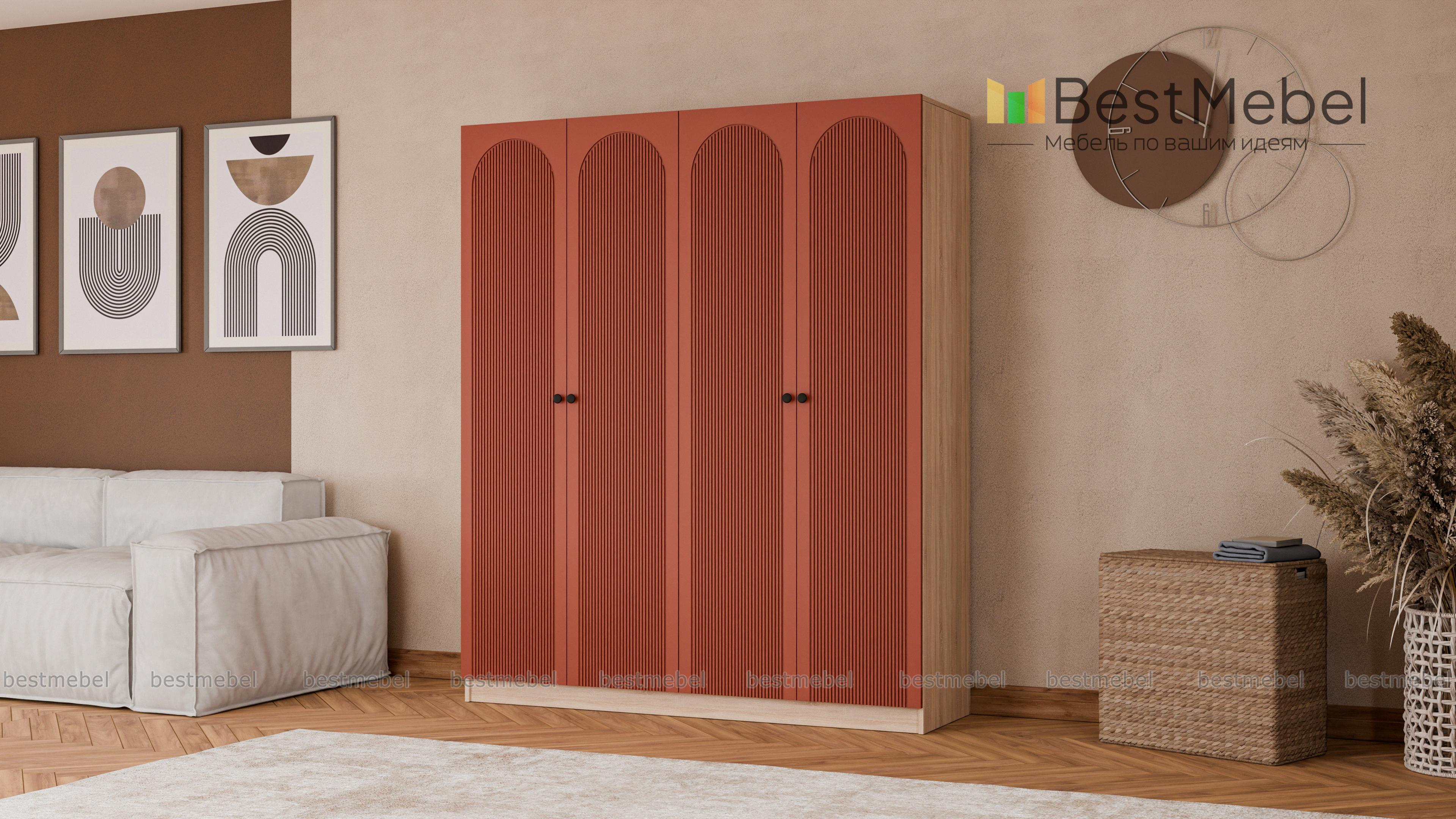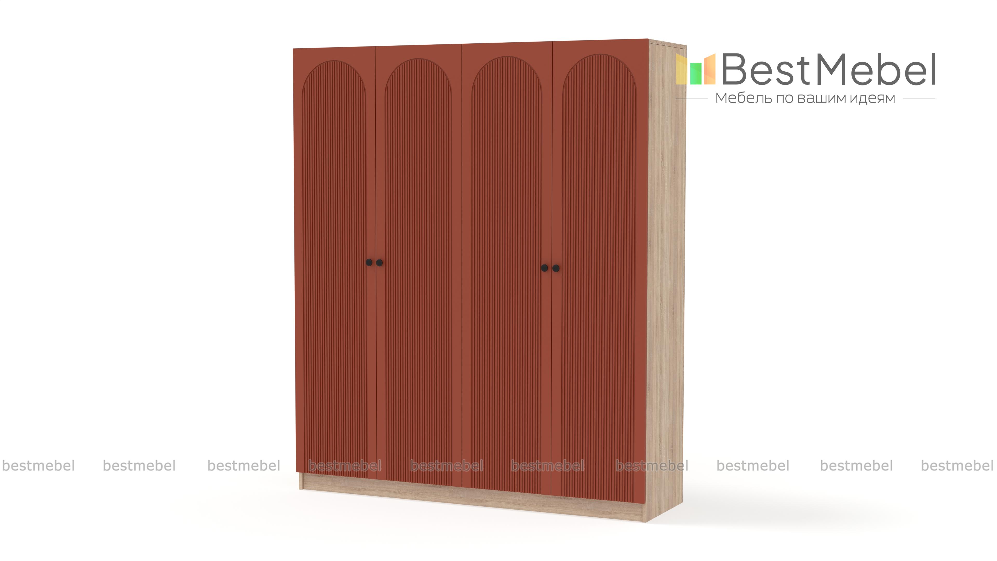 Шкаф распашной Рене 29 BMS — вместительный и очень стильный в темном оформлении. Фасад этой четырехдверной модели, изготовленной из ламинированной ДСП и МДФ, украшает геометричная фрезеровка с элегантными арками, на дверцы установлены небольшие круглые ручки. Два платяных отделения — оптимальное решение для хранения одежды, обуви и аксессуаров двух человек. Купить шкаф распашной Рене 29 BMS вы сможете на сайте нашего интернет-магазина, по желанию изменив размеры, цвет и компоновку.