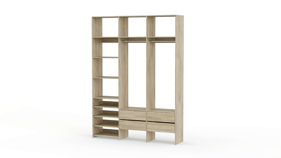 Стеллаж для одежды Мирта 98 BMS поможет вам организовать пространство в прихожей или гардеробной. Открытая система хранения включает в себя две платяные штанги, под которыми располагаются четыре ящика для мелочей, ряд выдвижных полок и стандартные бельевые. Прочная ламинированная ДСП, из которой изготовлен стеллаж, способна выдерживать большие нагрузки. Купить стеллаж для одежды Мирта 98 BMS, выполненный по индивидуальным размерам, приглашаем в наш интернет-магазин.