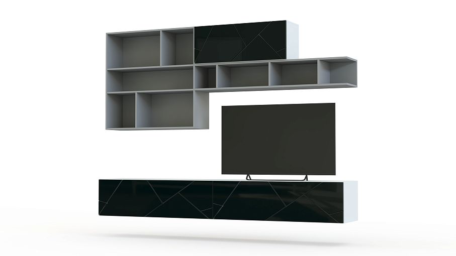 Стенка для гостиной Санни 9 BMS займет центральное место в интерьере и поможет нестандартно оформить зону ТВ. Модульная композиция привлекает сочетанием лаконичного дизайна и оригинального цветового решения – корпус серых тонов, черные глянцевые фасады с геометричной фрезеровкой и яркие акценты полок. В комплект входят навесные модули – две тумбы с выдвижными ящиками, шкафчик с откидной вверх дверцей и открытые книжные полки. Купить стенку для гостиной Санни 9 BMS приглашаем на сайт нашего интернет-магазина.