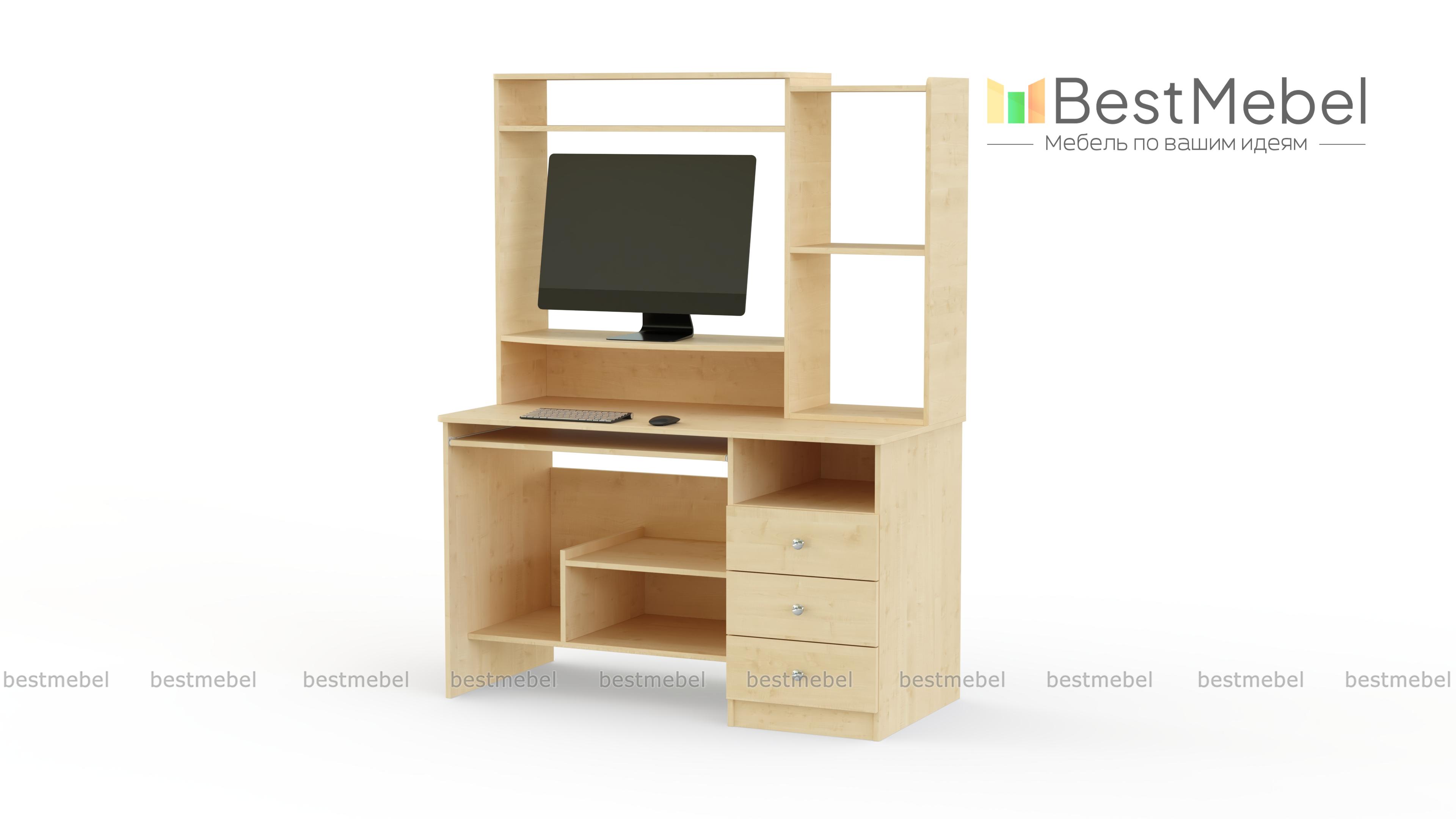 Добротный стол, с множеством функциональных мест, предназначен для комфортной работы за компьютером. Стол имеет специально отведенное место для компьютерного блока, монитора. Для клавиатуры имеется выдвигающаяся полка, в наличии вместительная тумбочка с 3 выдвижными и 1 открытым ящиком. В верхней части стола множество открытых полок для размещения всего необходимого и элементов декора. Купить стол Рома можно для детской комнаты, он будет исполнять роль письменного стола. Базовые размеры могут быть увеличены.