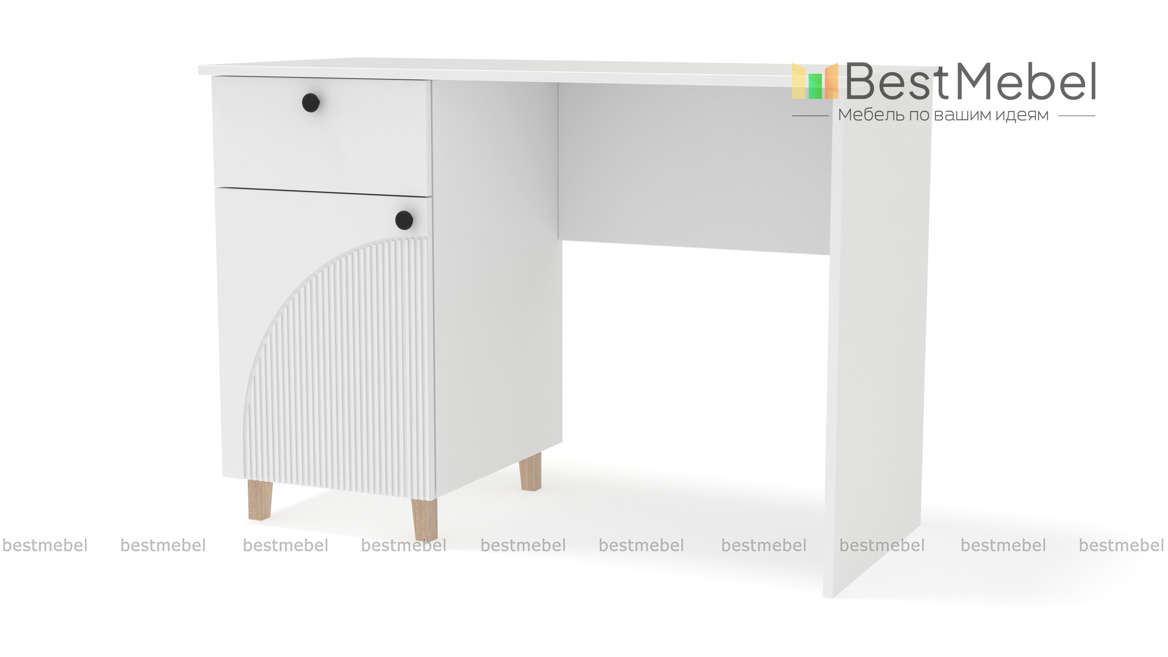 Стол письменный Вивьен 1 BMS поможет организовать комфортное и эстетичное рабочее место. Просторная столешница удобна для размещения компьютера и письменных принадлежностей, а для хранения канцелярских мелочей и бумаг предусмотрена тумба с выдвижным ящиком и дверцей. Прочный каркас из ЛДСП дополняет стильный рифленый фасад. Купить стол письменный Вивьен 1 BMS вы всегда сможете на сайте нашего интернет-магазина в нужном размере и любых оттенках из каталога.