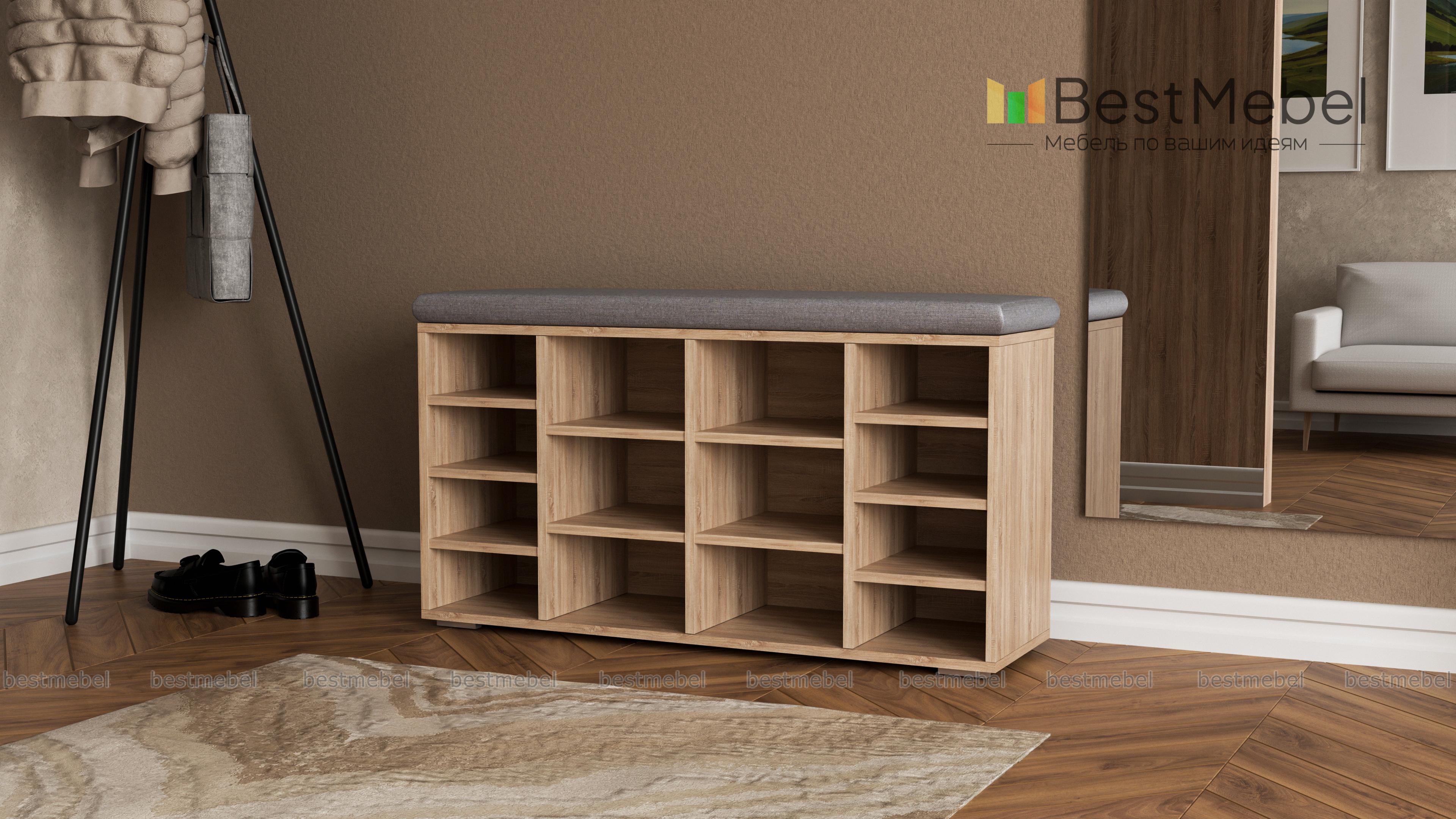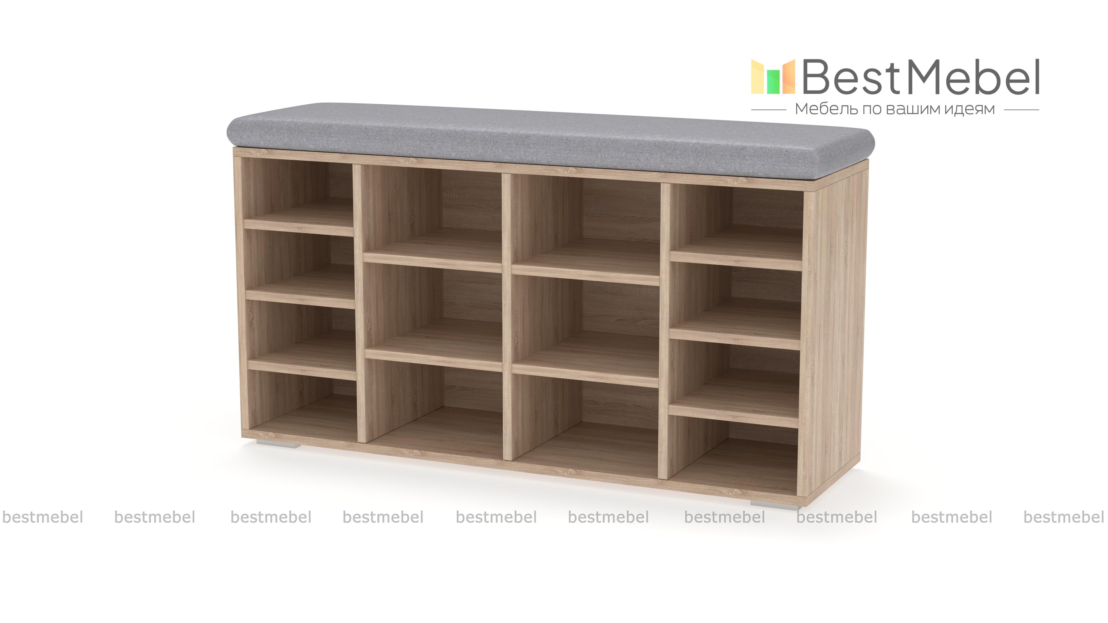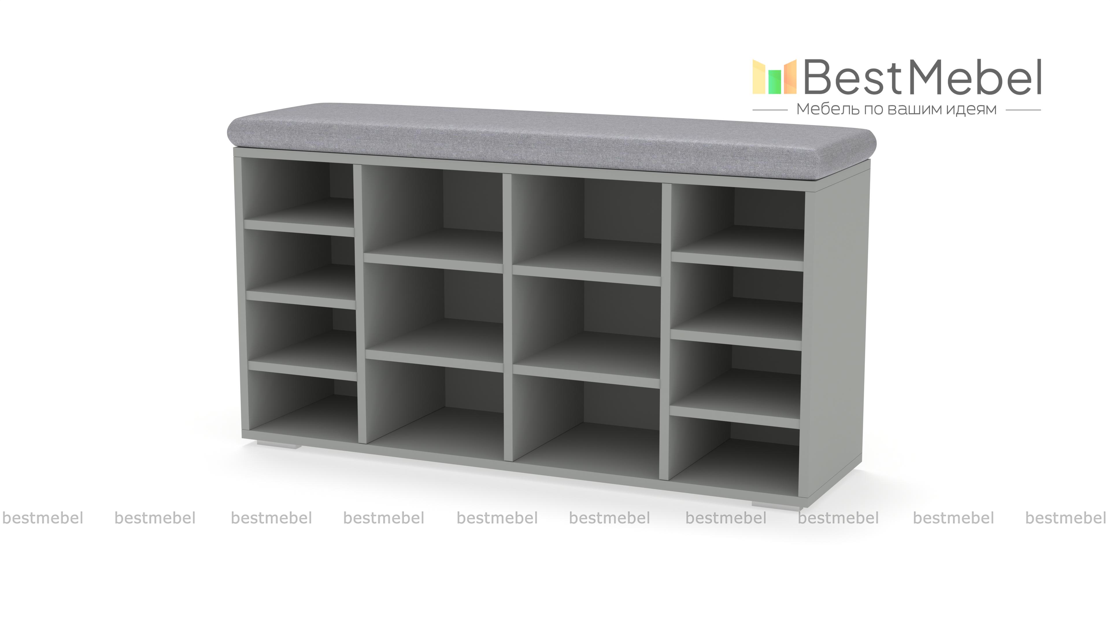 Тумба для обуви Шелф BMS гармонично впишется в современные интерьеры и поможет оптимизировать хранение обуви, уходовых средств и аксессуаров. Широкая низкая модель оборудована нишами разных размеров и просторной столешницей, которую элемент в мягкой обивке превращает в комфортную скамью. Открытая конструкция позволит быстро найти нужную пару и обеспечивает содержимому проветривание. Купить тумбу для обуви Шелф BMS по отличной цене приглашаем в наш интернет-магазин.