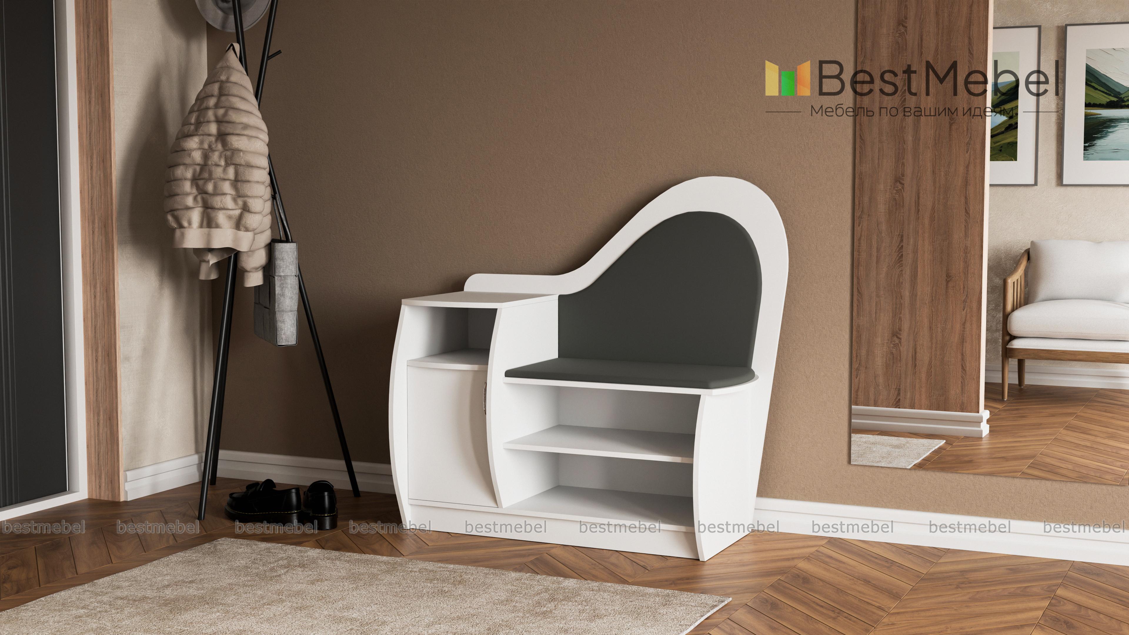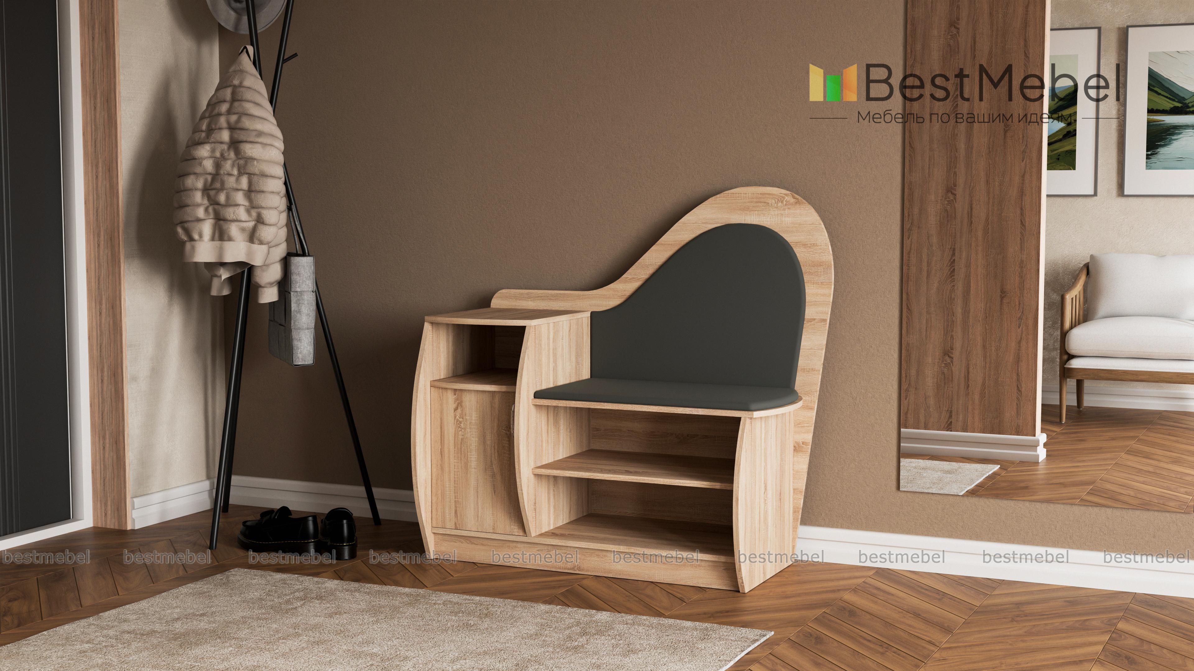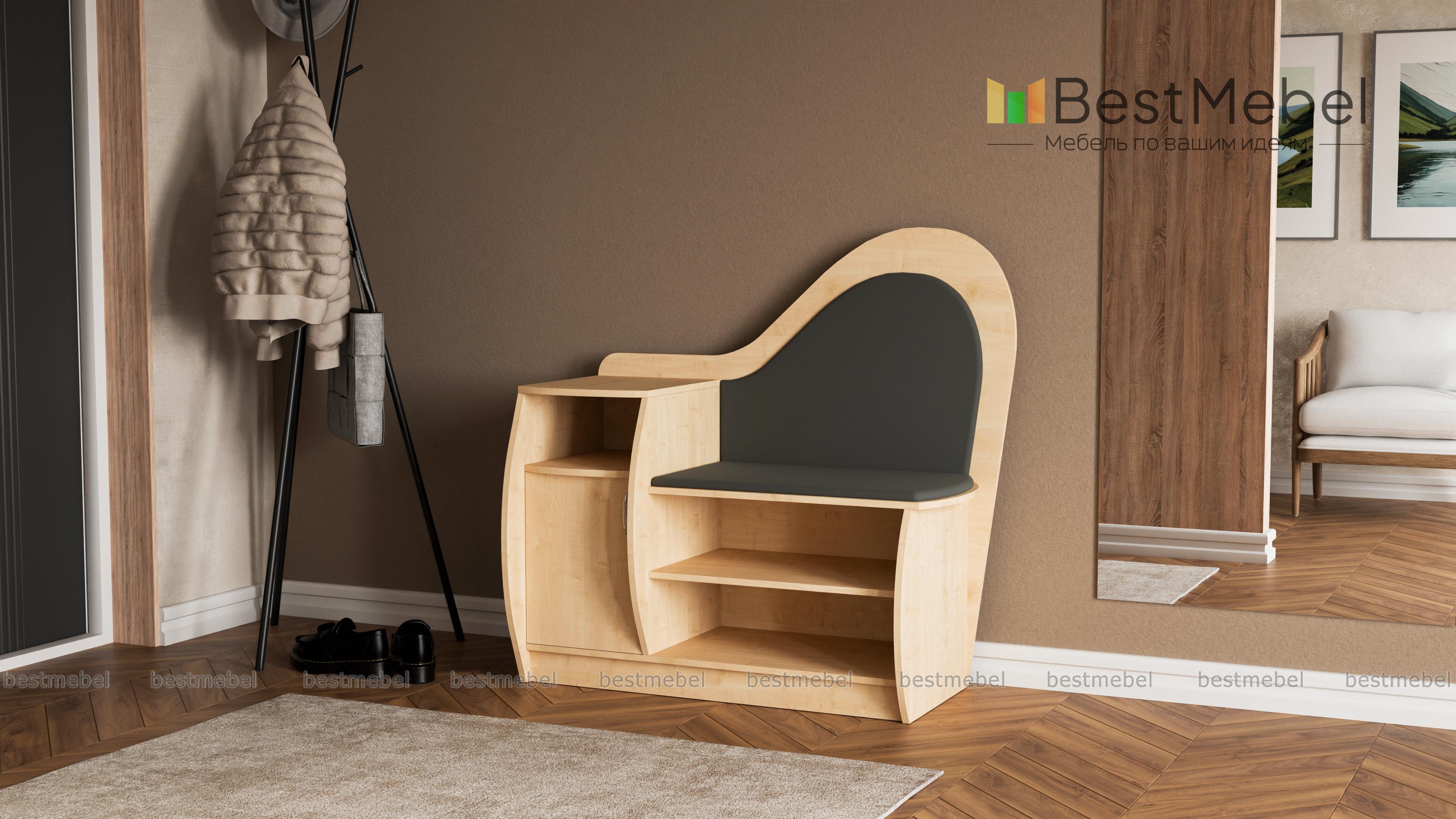 Очень красивая и удобная тумба для обуви. Выбрали цвет корпуса и обивки, а также размер, подходящие под нашу прихожую. Все изготовили в срок, аккуратно доставили и собрали.
