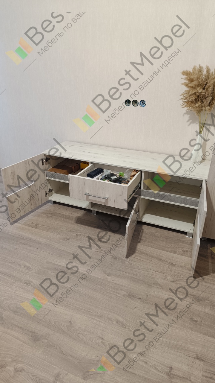 Тумба ТВ 1.1 BMS поможет оборудовать эффектную и функциональную гостиную или спальню в современном стиле. Низкая тумба минималистичного дизайна оборудована широкой столешницей, которая легко разместит ТВ с большой диагональю, распашными отделениями и выдвижным ящиком для мелочей. Белые глянцевые фасады, декорированные скругленным вырезом с древесной вставкой, устойчивы к механическим повреждениям и просты в уходе. Купить тумбу ТВ 1.1 BMS вы всегда сможете в нашем интернет-магазине по лучшей цене.