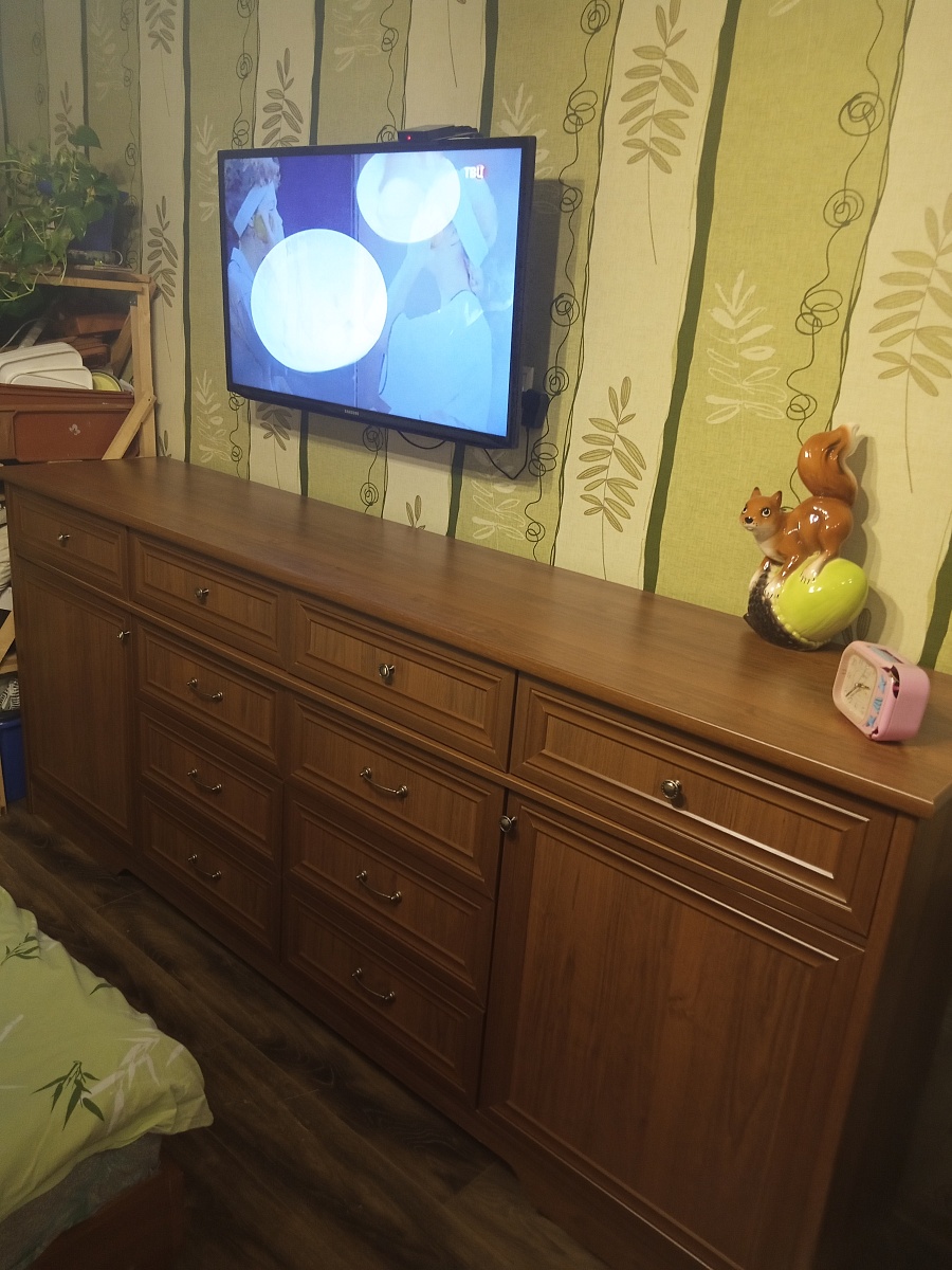 Долго искала большой комод на заказ, чтоб функционал был такой, как мне надо, пришлось ехать в магазин, для более подробной консультации, и выбора образцов наглядно, по качеству, цвету и.т.д, в итоги: после долго подбора, остановили на данном комоде, длина, 2.4,высота 1.0,изготовление было 3 дня, инструкция по сборке это вообще песня, лего отдыхает) качество отличное, цвет вообще бомба оказался на деле, понравилось! Что на всех деталях были штрих коды, и описание, что за деталь, (собирали 1.5 дня) однозначно рекомендую!!!!!! Спасибо производителю......))))) надеюсь, что прослужит не один год.