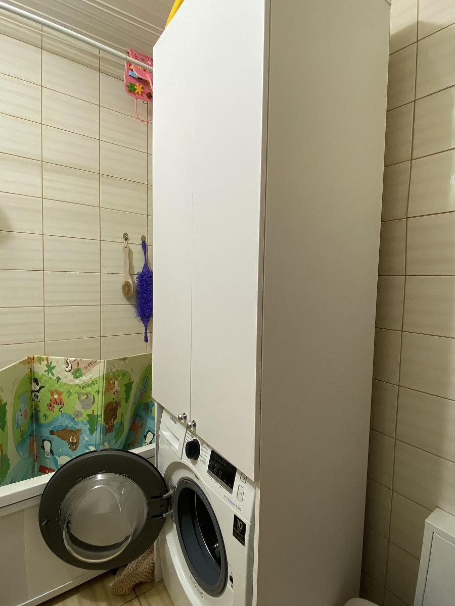 Шкаф заказали в ванную, для полотенец и прочего, хорошо вошла машинка, менеджер заранее уточнил ее размеры. Минус, это что при закрытии, шкаф немного ходуном ходит, надо было бы еще заднюю панель побольше делать и что-то мы не догадались сделать выпил под трубу, тогда бы лучше к стене встал.