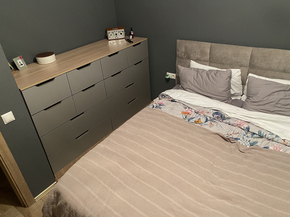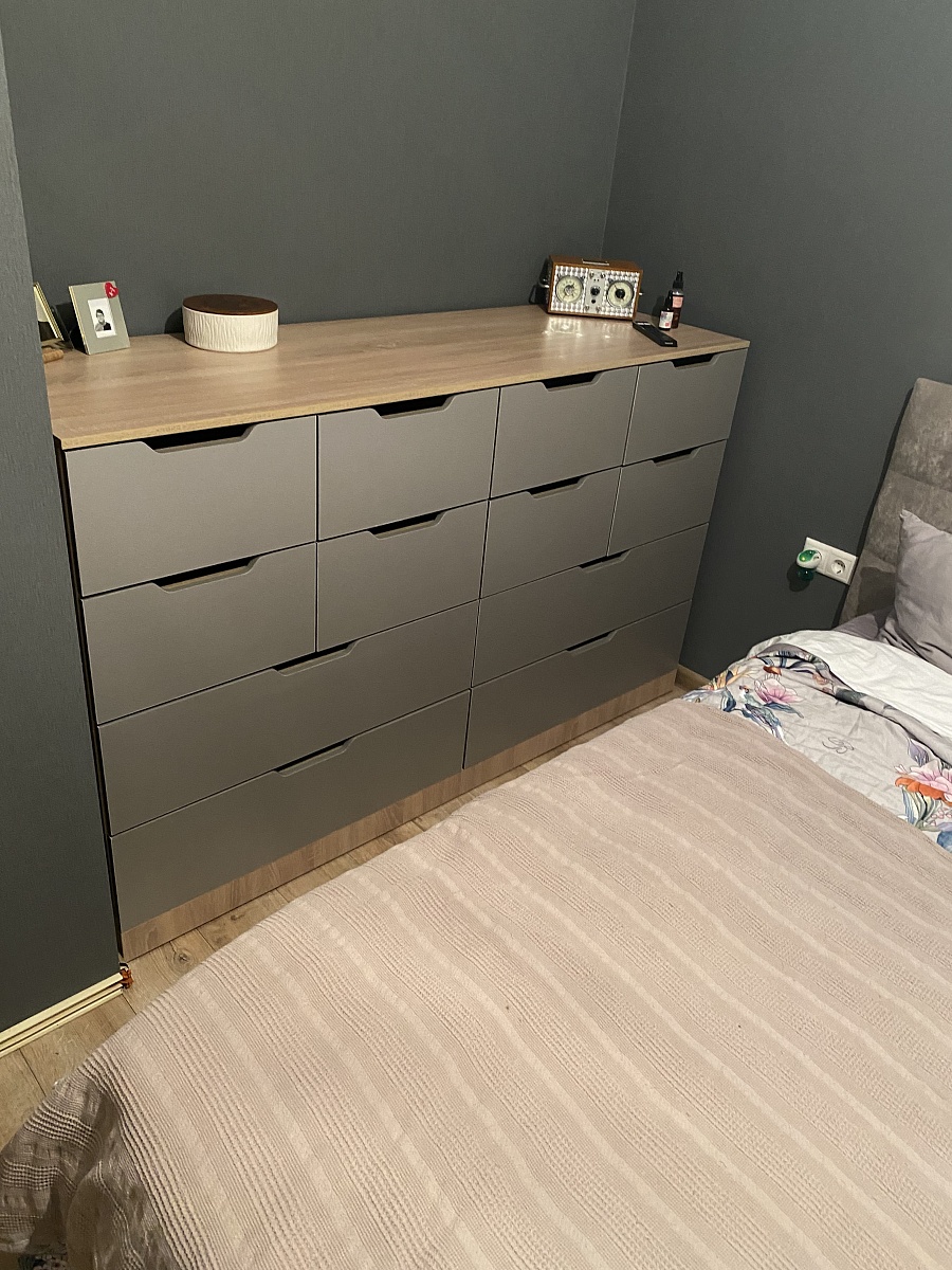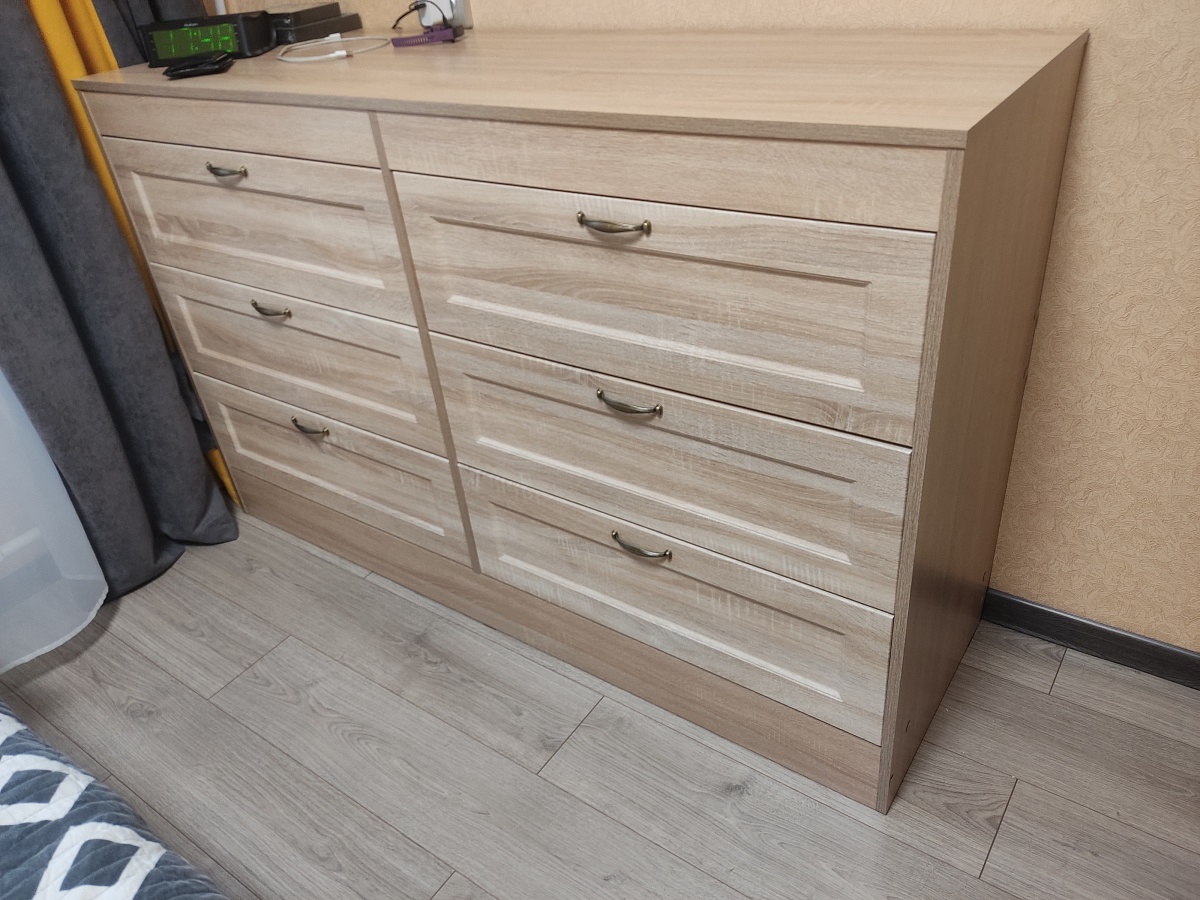 Комод смотрится отлично.В целом к качеству претензий нет. Но заказывали под индивидуальный размер, надеясь получить ящики поглубже, а в итоге огромный цоколь и такая же огромная декоративная планка сверху (