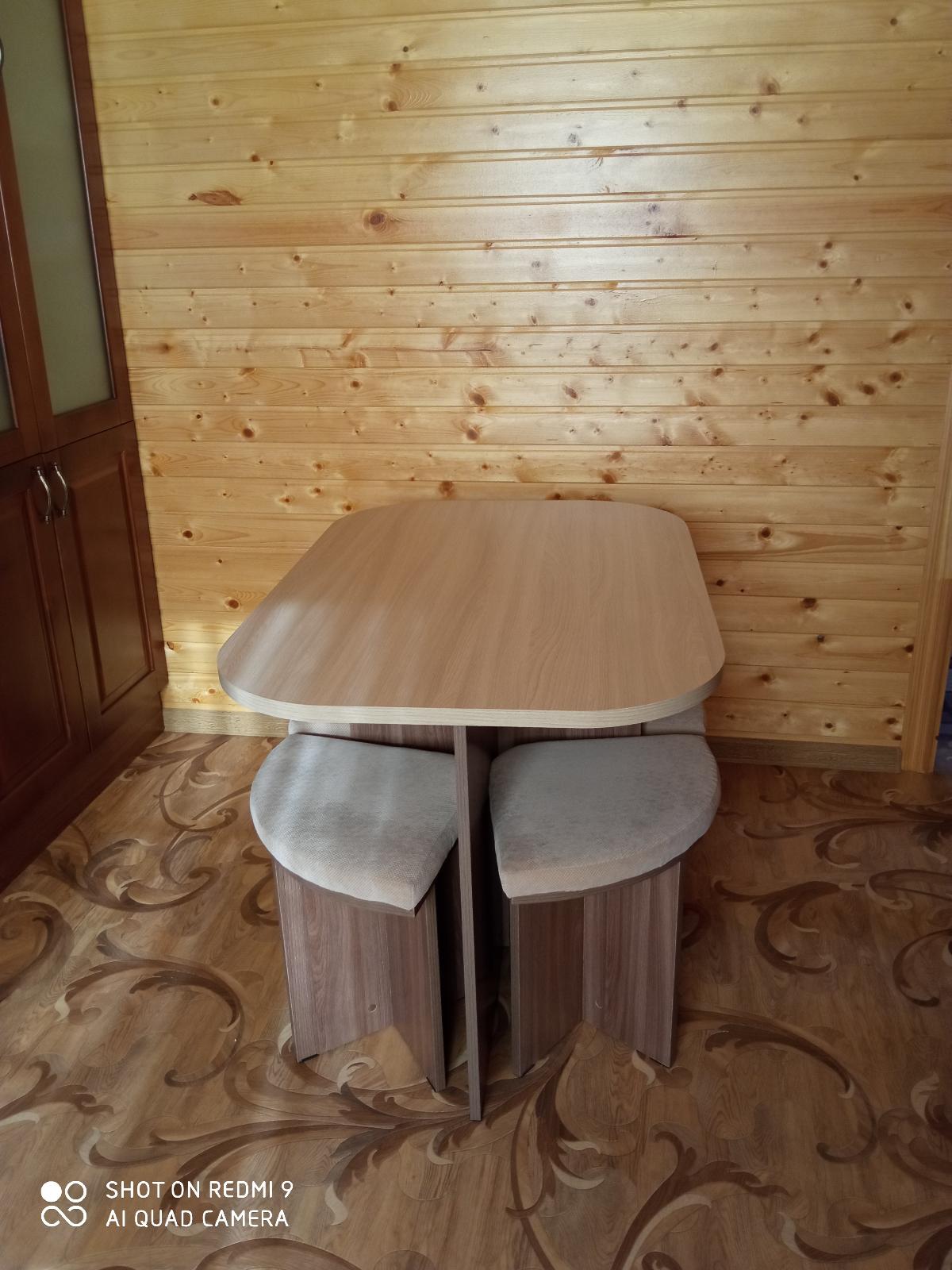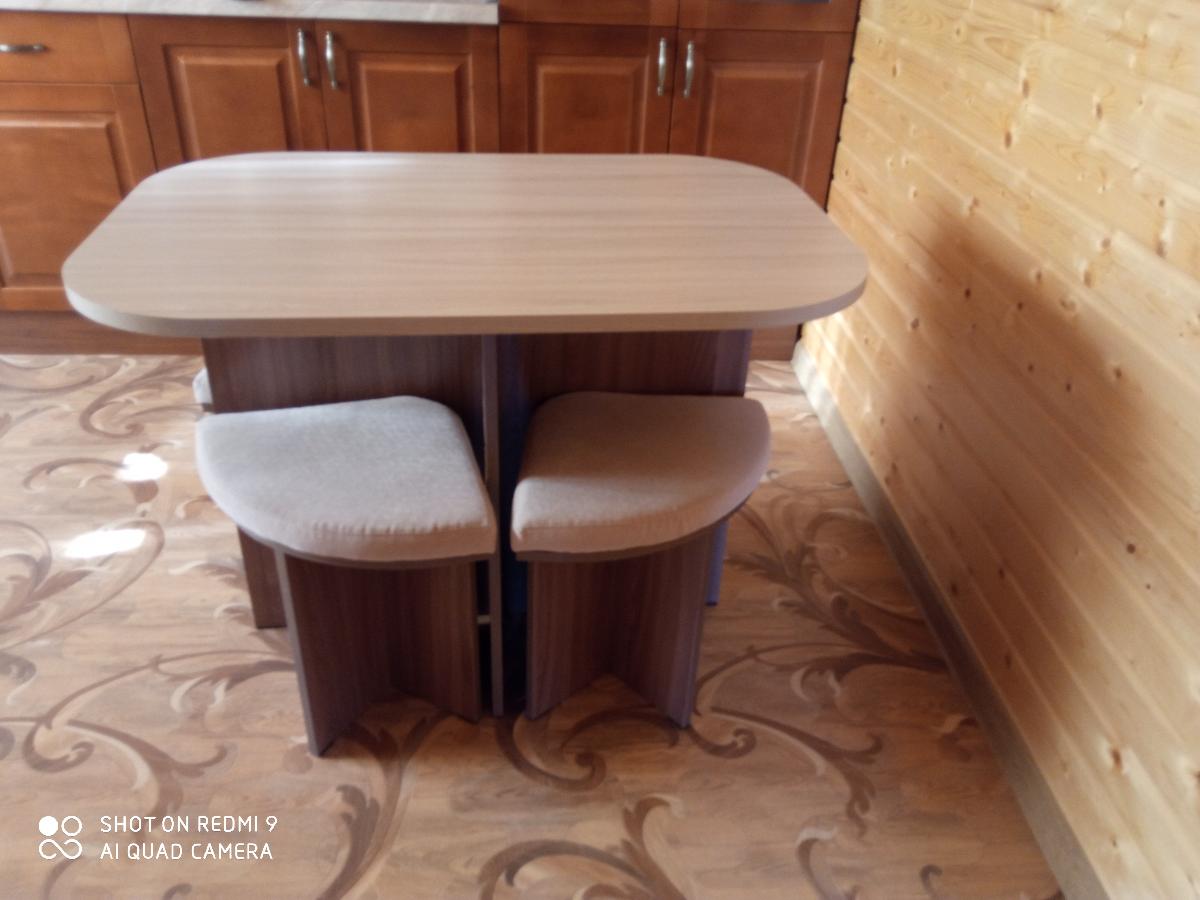 Заказ 00000697638. Действительно, необычный дизайн. Мы с мужем восторге. На кухне экономит место. Очень удобен и практичен. Цена и качество хорошее. Менеджер, молодец! Подсказал в выборе ткани на табурет и попал в точку. Телефон завис в это время, не могла ориентироваться в выборе ткани. Огромное ему спасибо, за внимательность, чуткость, знание своего дела! Доставка быстрая, не смотря на то, что в дороге пробили колесо. Всё доставлено вовремя.Собрали сами, всё без проблем. Будем ещё заказывать. 😊