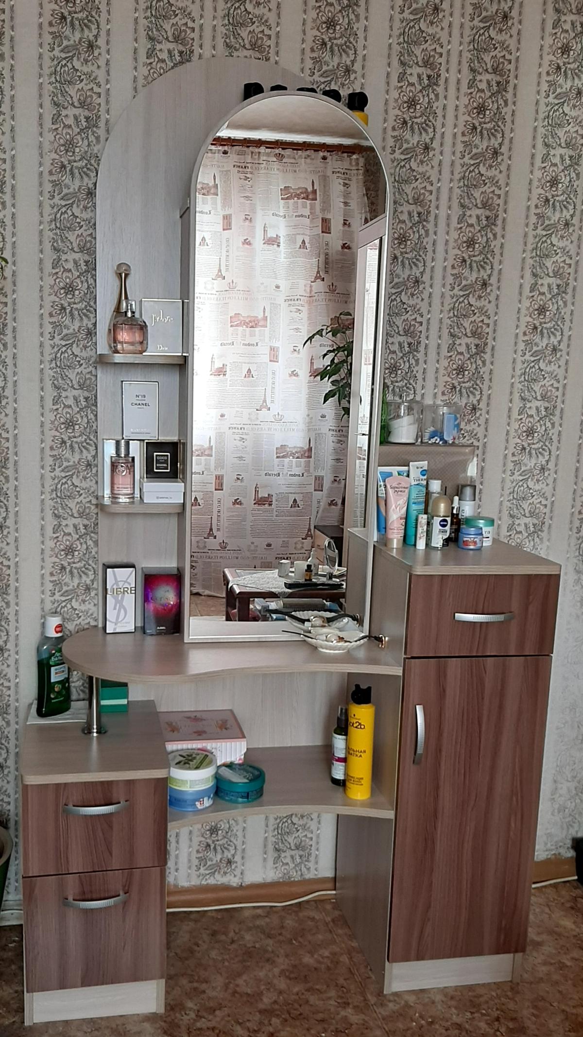 Очень удобный туалетный столик , зеркало большое, за ним тоже полочки-очень вместительный.Спасибо магазину за возможность изготовления в нужном цвете.Подобрали под, заказанную здесь же ,гостинную Атлантида.Очень довольна!Номер заказа 00000665718