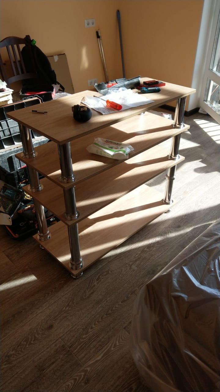 Заказ 00000677121 (458814). Оформил заказ на тумбу по индивидуальным размерам вечером 24.05.21. На следующий день оператор перезвонил, уточнил детали. В тот же день прислали эскиз тумбы на согласование. 28 мая доставили тумбу в удобное для меня вечернее время. Качество ДСП и фурнитуры порадовало. По количеству все винтики были на месте. Собрал тумбу самостоятельно. Стойки сквозные через промежуточные полки, поэтому высоту между полками можно регулировать. Очень удобно! Рекомендую!