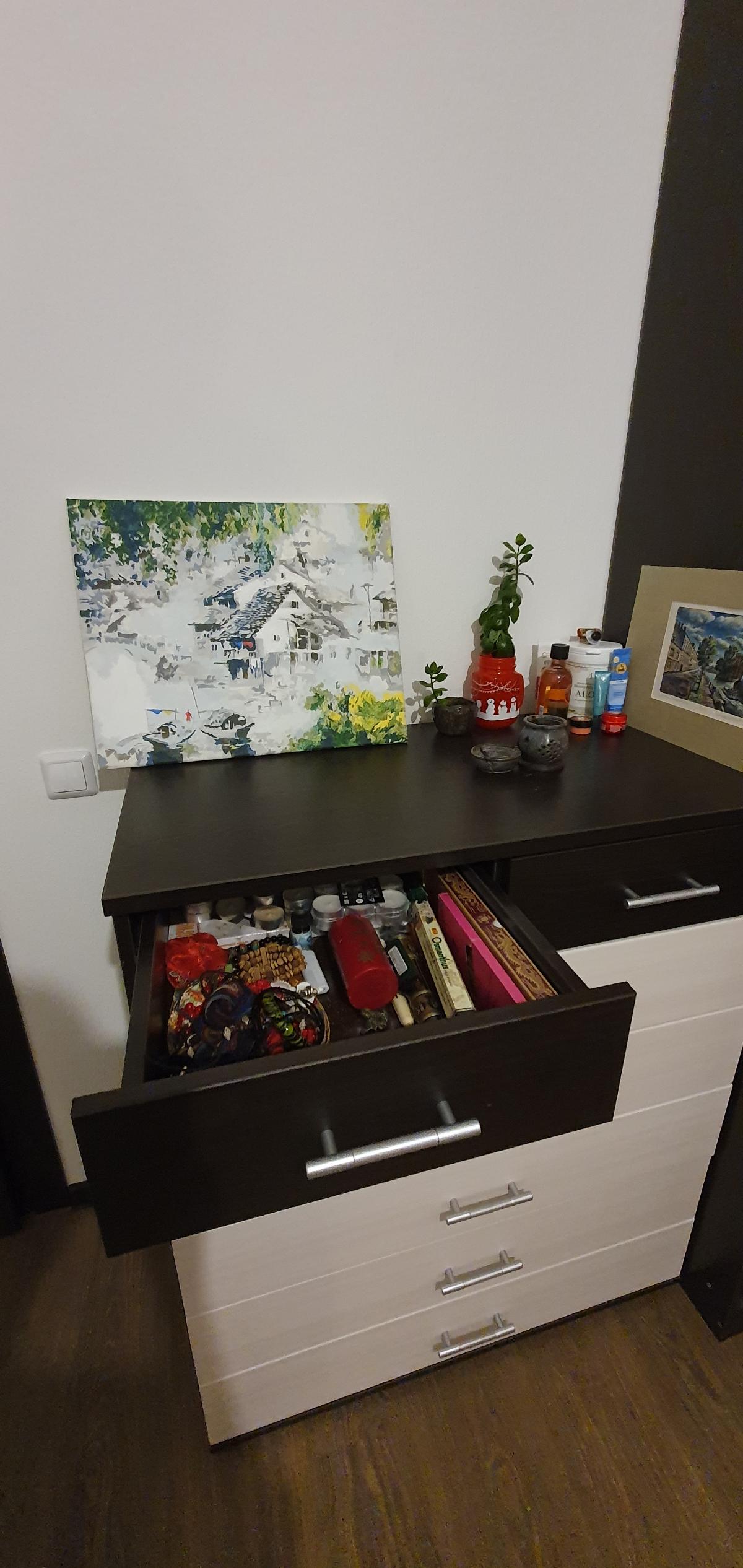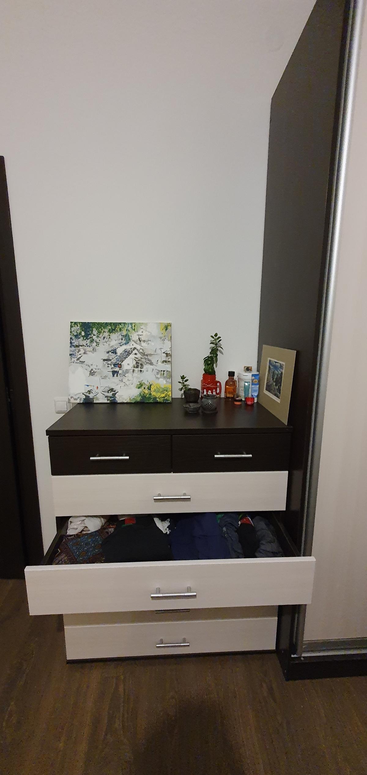 Изначально хотели купить комод в "Икее", но не было подходящего размера. Заказывали комод под свои размеры, долго выбирали из каталога. Комод "Михаил-Люкс-12" идеально вписался в дзен-буддийский дизайн квартиры (см.фото)! Комод очень вместительный, помещаются почти все вещи, на шкаф (заказанный на этом же сайте в комплект) остается совсем немного. Очень радует отдельный цвет верхних ящичков, в одном из которых разместились все мои ароматические принадлежности!) Спасибо большое!
