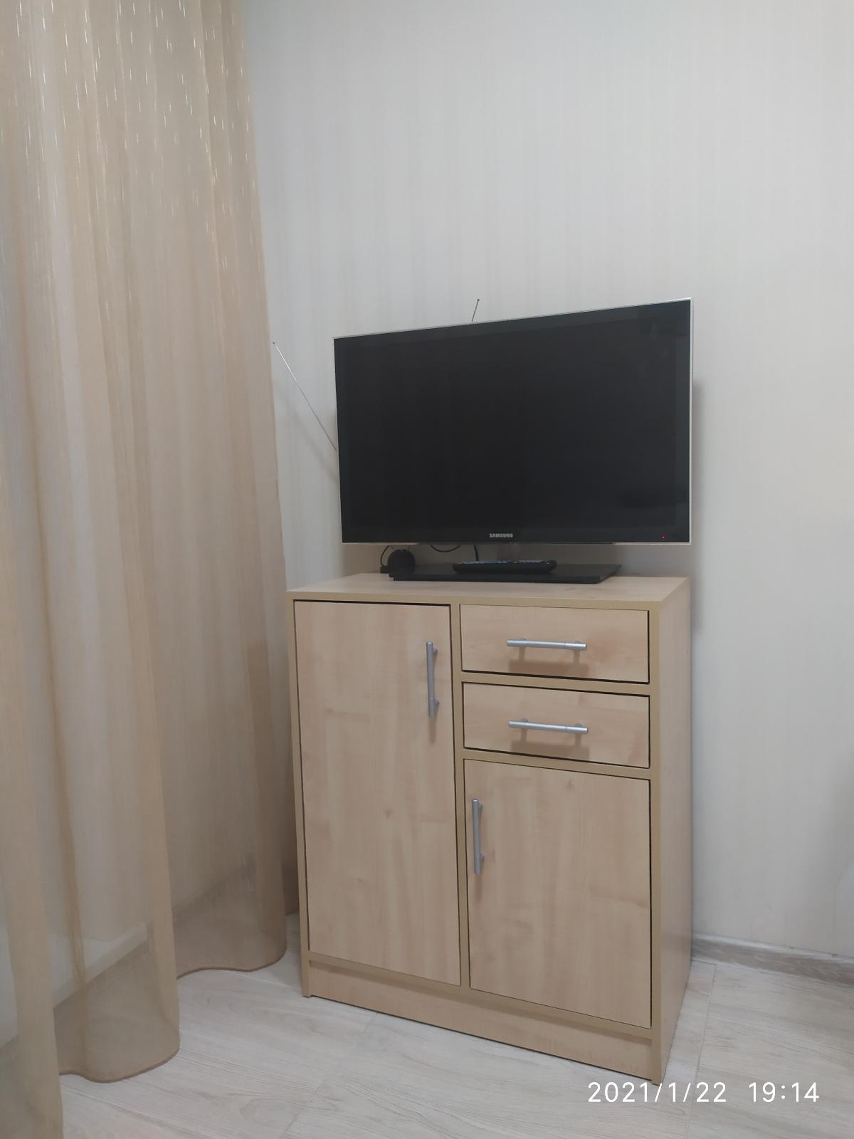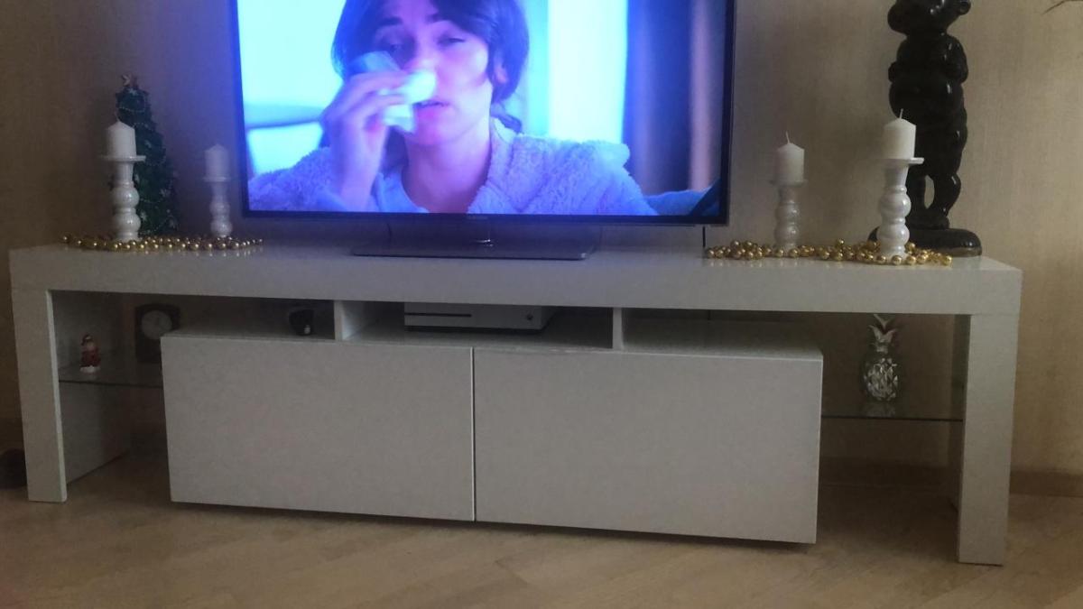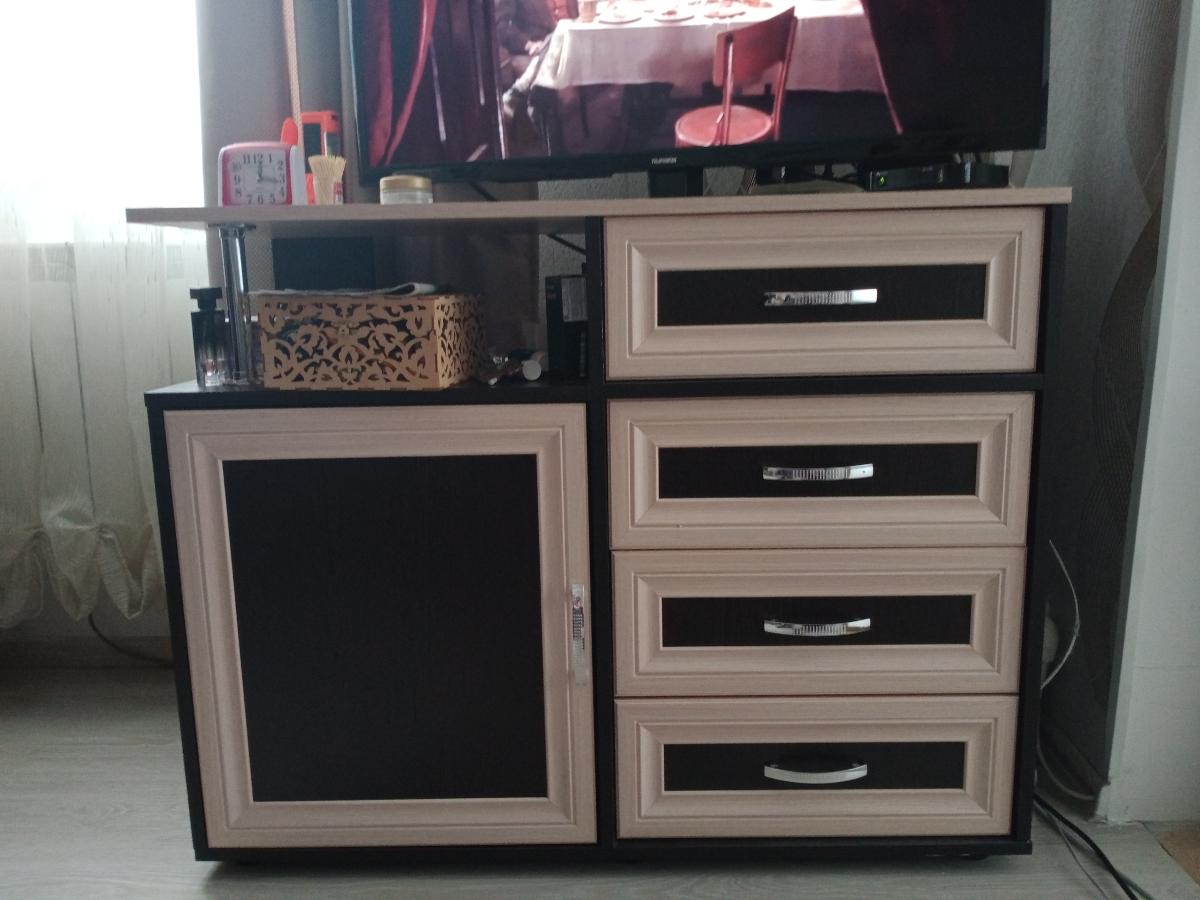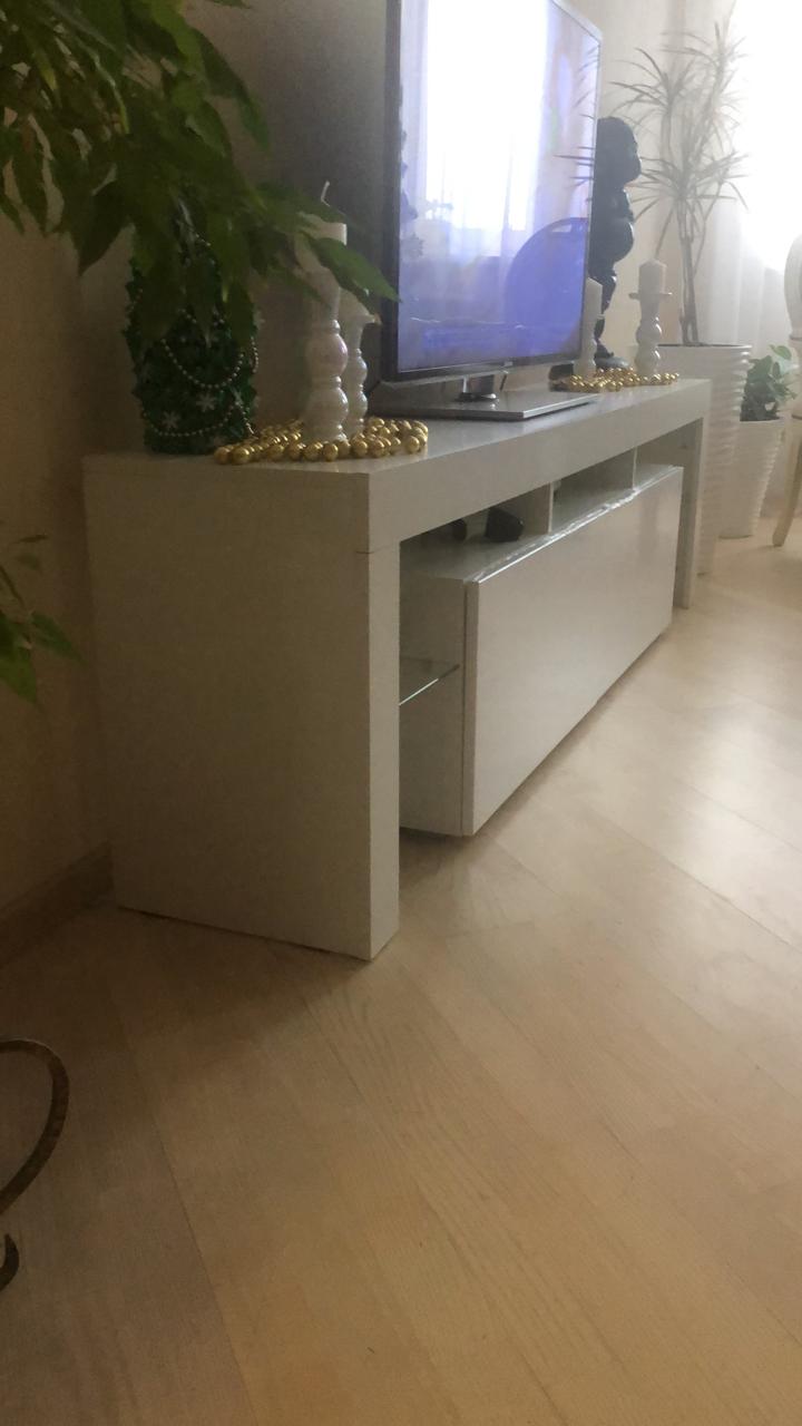 Убили 2х зайцев)) Не хватало мест для хранения посуды на кухне, и не могли повесить телевизор на стену потому что стена в один кирпич не выдержала бы вес. Очень рады что можно выбирать самому размер и цвет. На фото цвет Клен. Качество отличное, изготовили и доставили быстро. Спасибо MebelShop