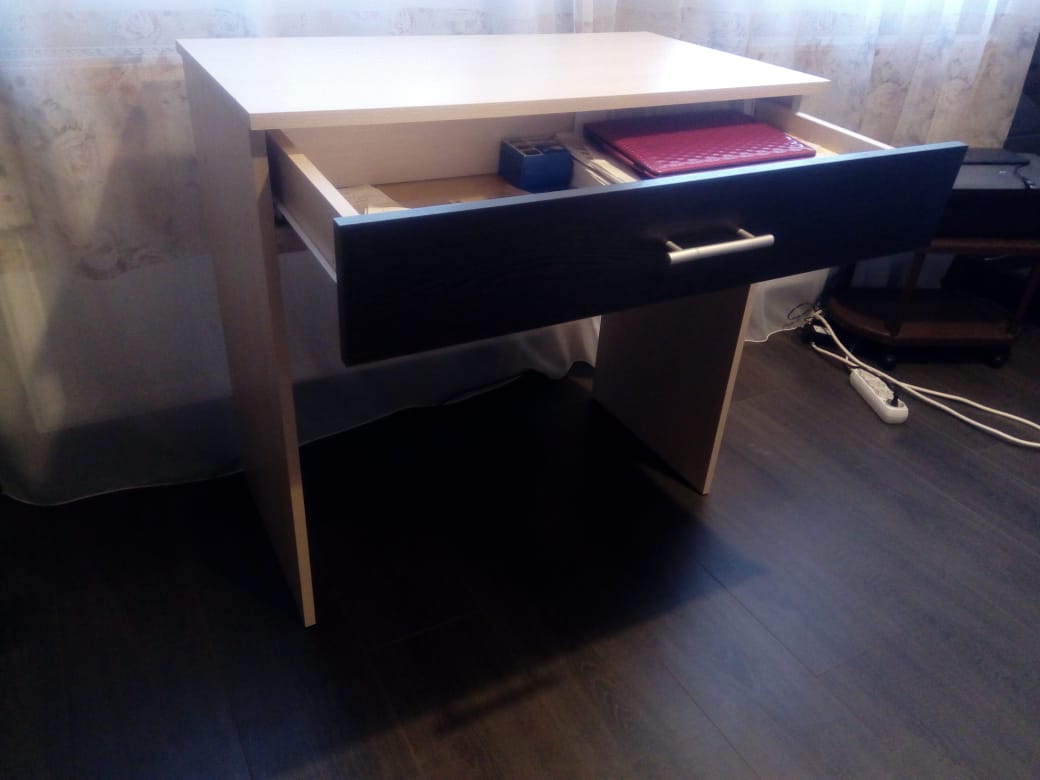 Стол получили по акции (Заказ 00000461809, изделие Стол Клео СБ-2017). При работе на удаленке оказался очень кстати. Хорошо вписался в интерьер и по размеру и по цвету. Немного расстроил маленький скол на столешнице, но решили, что "дарёному коню в зубы не смотрят" и "отремонтировали" замазкой для ламината.