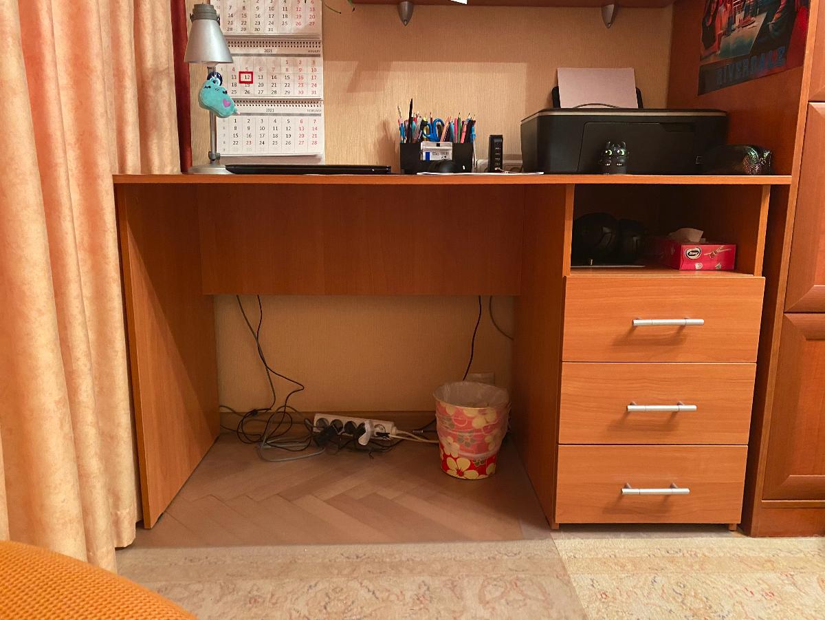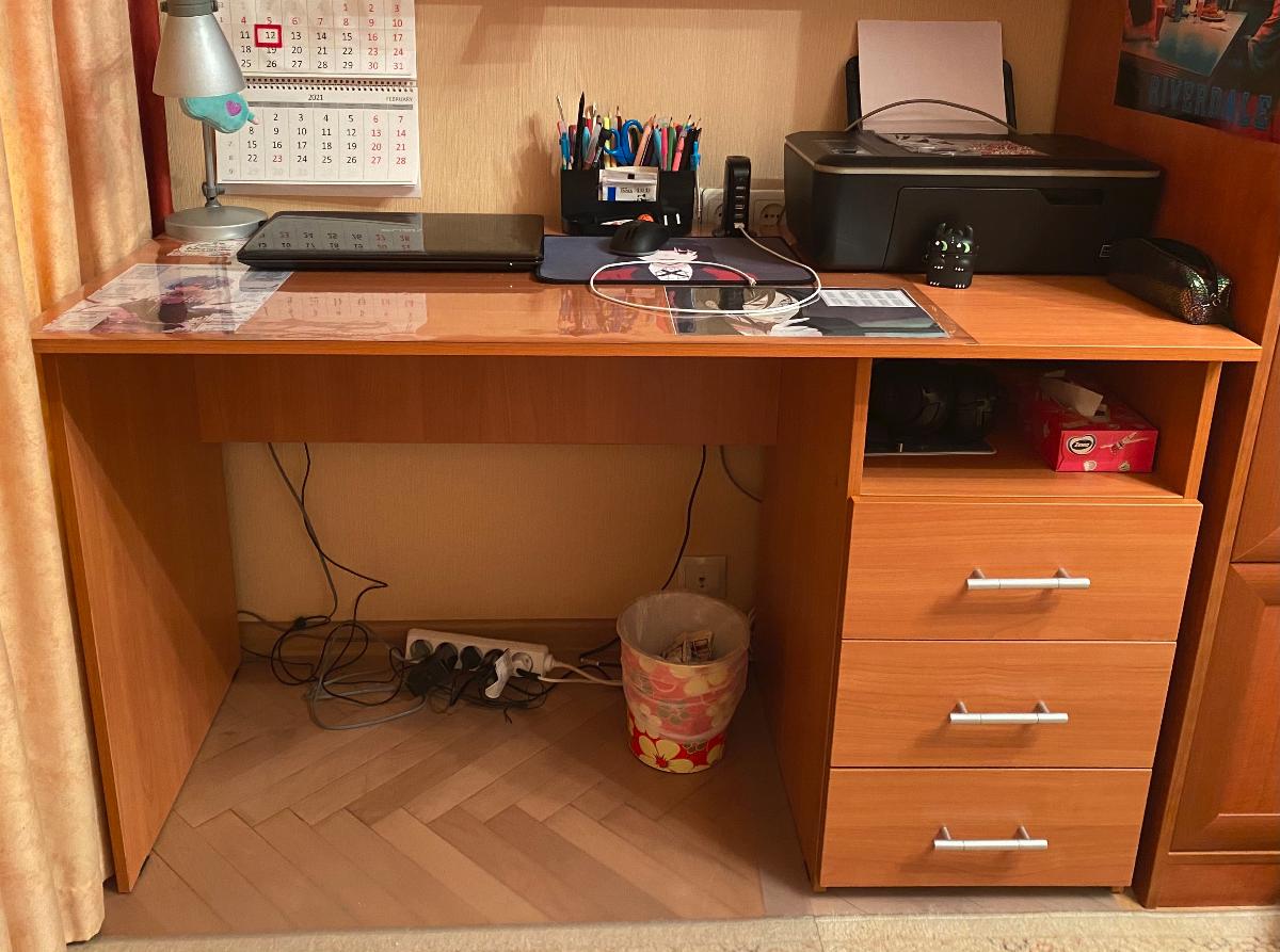 Очень стильный, удобный, негромоздкий, и не выглядящий офисным стол для двух школьниц. Прекрасно вписался в интерьер, не хватает только прорезей для кабелей в столешнице. Одной тумбочки вполне хватает.  Удобные доводчики в ящиках. Не терпит влаги - кот разлил воду, не заметили, столешница вздулась, отошла на закруглении. Обязательно использовать накладки.
