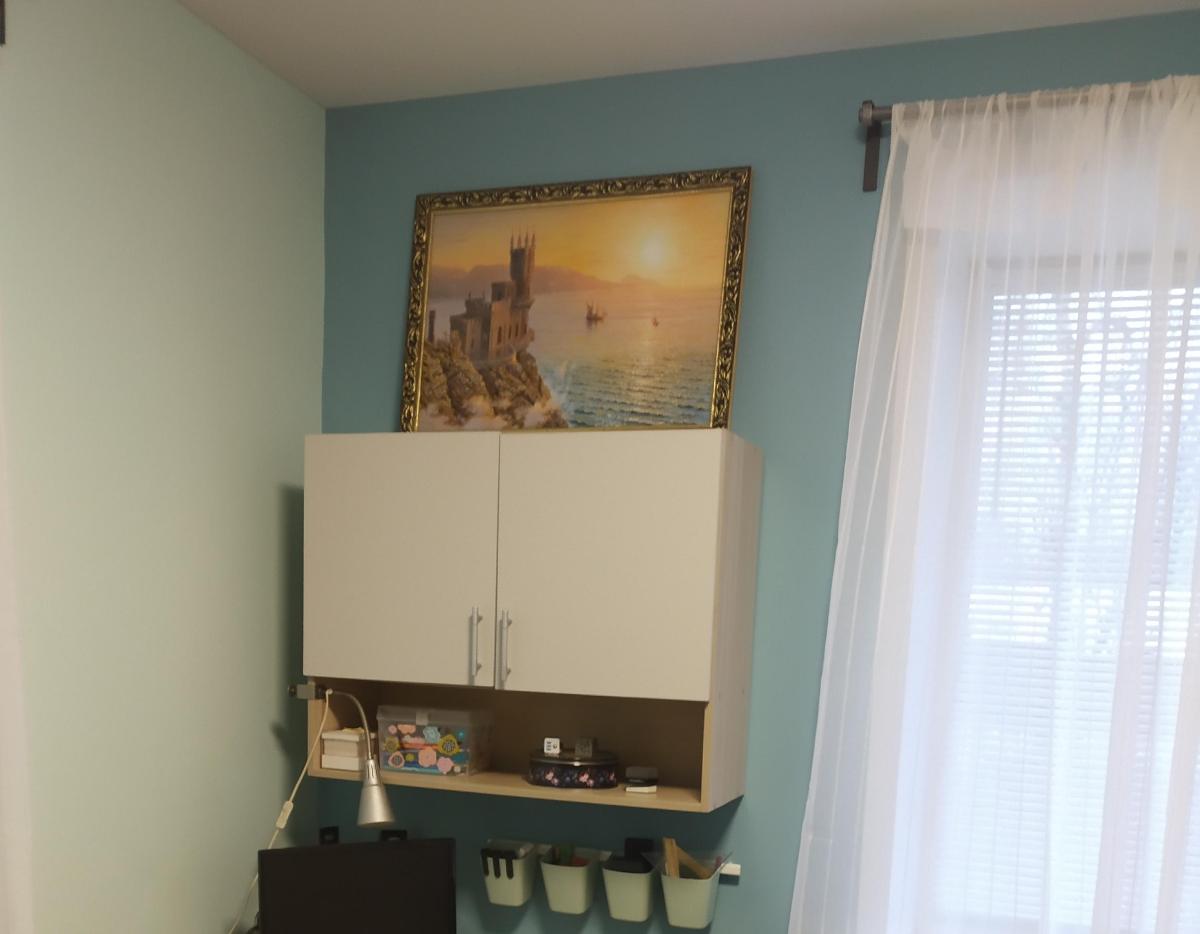 Полка навесная для кухни, но мы повесили ее над письменным столом в комнате подростка. Изготовили из ЛДСП, фасад серый, корпус ясень шимо светлый. Всю мебель в эту комнату заказывали в единых цветах, подбирали из разных коллекций, так вышло дешевле. Качество нормальное, собирали сами.