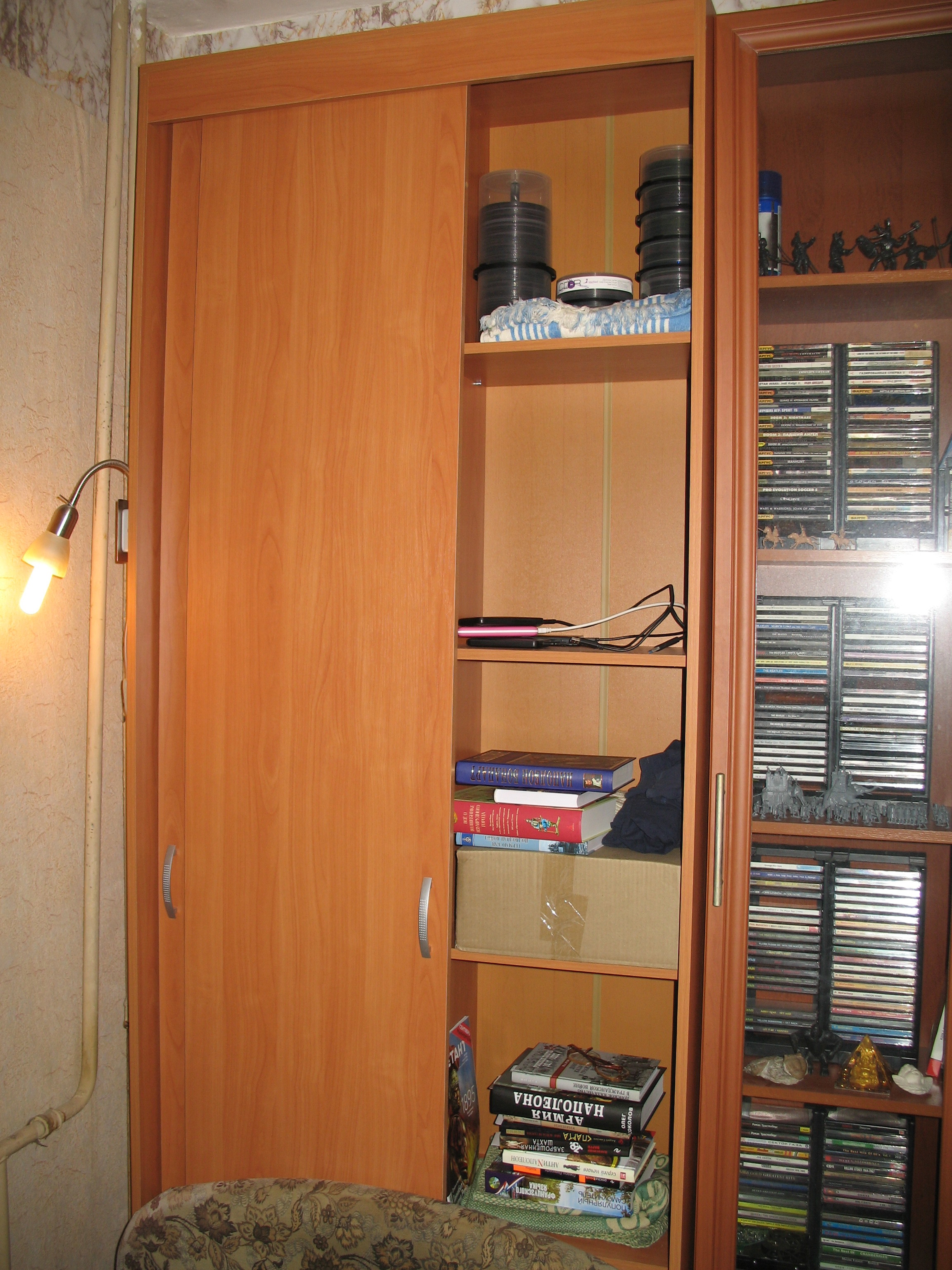 Очень долго искал навесной шкаф в нишу над кроватью, никак не мог найти подходящего варианта... Пока вдруг не осенило: а что если вместо навесного шкафа купить шкаф-купе, да и упереть в него кровать. Идея показалась гениальной. Во-первых, не надо будет бурить перфоратором дырки в капитальной стене, чтобы повесить навесной шкаф, что очень облегчает решение задачи. Во-вторых, вместимость шкафа-купе почти в 3 раза окажется больше навесного шкафа, что уже само по себе решающий аргумент. Сказано-сделано, залез в И-нет и почти сразу наткнулся на данный эконом-вариант шкафа-купе производства компании Bestmebelshop. Что называется, глаз на этот шкаф положил моментально. Во-первых, это просто-таки идеальный вариант для такой маленькой комнаты как у меня, во-вторых, порадовало неплохое соотношение цена-качество (дешевле похожих вариантов в И-нете не нашёл). Шкаф очень понравился! Очень вместительный! На нижние полки я положил хлам (старые журналы и газеты, освободив 2 отделения другого шкафа). Полки слева пойдут под бельё, полки справа под книги. Что особенно отрадно, на верхнюю полку помещаются 2 ряда по 3 в ряд боксов с СД- и ДВД-дисками.   В общем спасибо Bestmebelshop и мастеру Андрею из петербургского отдела Bestmebelshop, который мне этот шкаф собрал.
