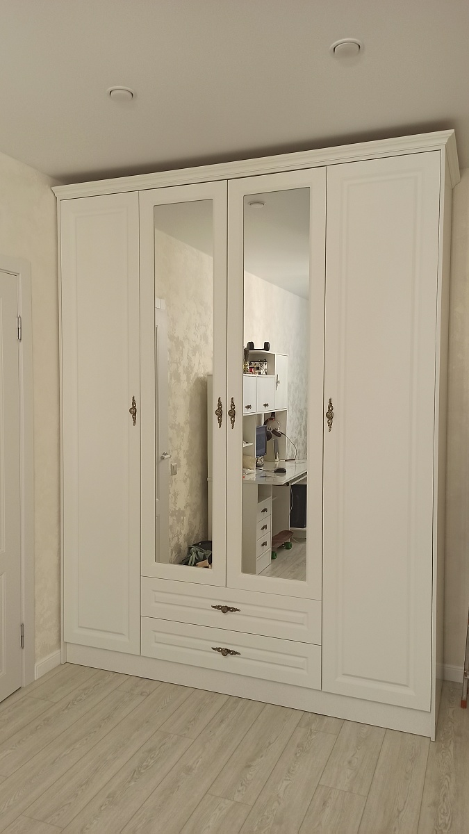 Заказ №1131642  , изделие ЭСКИЗ №00000943206 Распашной шкаф Янна 5 BMS (1900х2500х600) (Белье - Платье - Белье (4)), ссылка для отзыва https://www.bestmebelshop.ru/catalog/shkafy-raspashnye/raspashnoy-shkaf-yanna-5-bms/Заказала распашной шкаф ЯНА   на сайте bestmebelshop  , выбрала необходимый мне размер (по высоте и ширине, и наполнению) .  Ширина-1900.Высота-2500. Глубина-600.Он отлично вписался  в  мой интерьер .Механизм распашных дверей очень прост и надежен. Он не требует сложного обслуживания и редко выходит из строя при правильной эксплуатации. Зеркала на дверях очень красиво смотряться  и расширяю пространство и смотреться удобно. Только  задняя стека зеркала была ничем не закрыта и смотрелось не очень ( заклеила их белой пленкой в цвет фасада). Шкаф   имеет  вместительные внутренние отделения, полки, вешалки и ящики, что позволяет удобно организовать хранение вещей.Данная модель  имеет  фрезеровку и карниз, что придает интерьеру уют и элегантность. Изготовили очень быстро и доставили в срок! Пришло все целое, сколов  и поврежденных деталей не было.  Материалы, из которых изготовлен шкаф , кажутся достаточно прочными и качественными. Поверхность гладкая, легко очищается от пыли и пятен. Сборку шкафа закала тоже у этой фирмы, мастер все быстро и качественно собрал.  Классический распашной шкаф Яна — это надежный и эстетичный выбор для тех, кто ценит традиционный стиль и функциональность. Надеюсь он прослужит долгие годы.